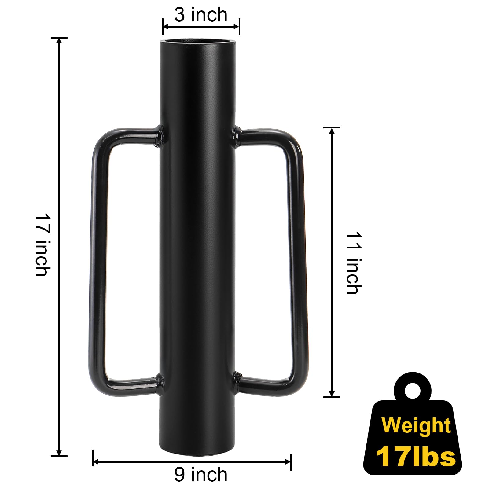 Yarlung 17lbs fence post driver with handle measures 9"W x 17"H, interior 2.7" diameter 11" deep, makes it easy for you to drive fence posts deep into the ground