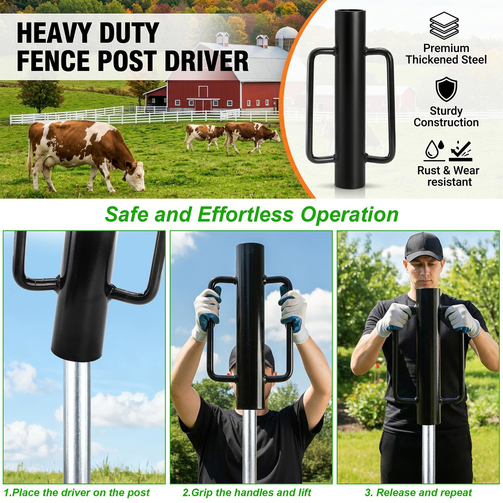 Heavy Duty Construction: Made from high quality steel with black powder coated, our fence post driver is durable, rust and wear resistant, providing reliable performance for years