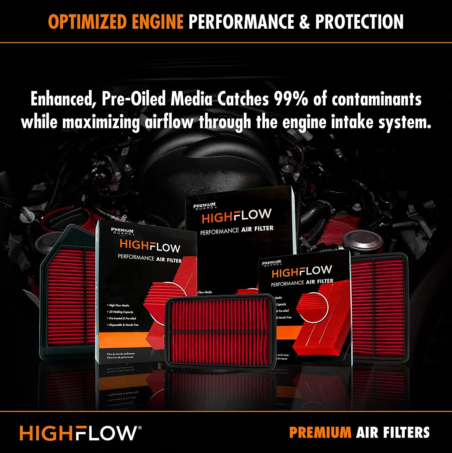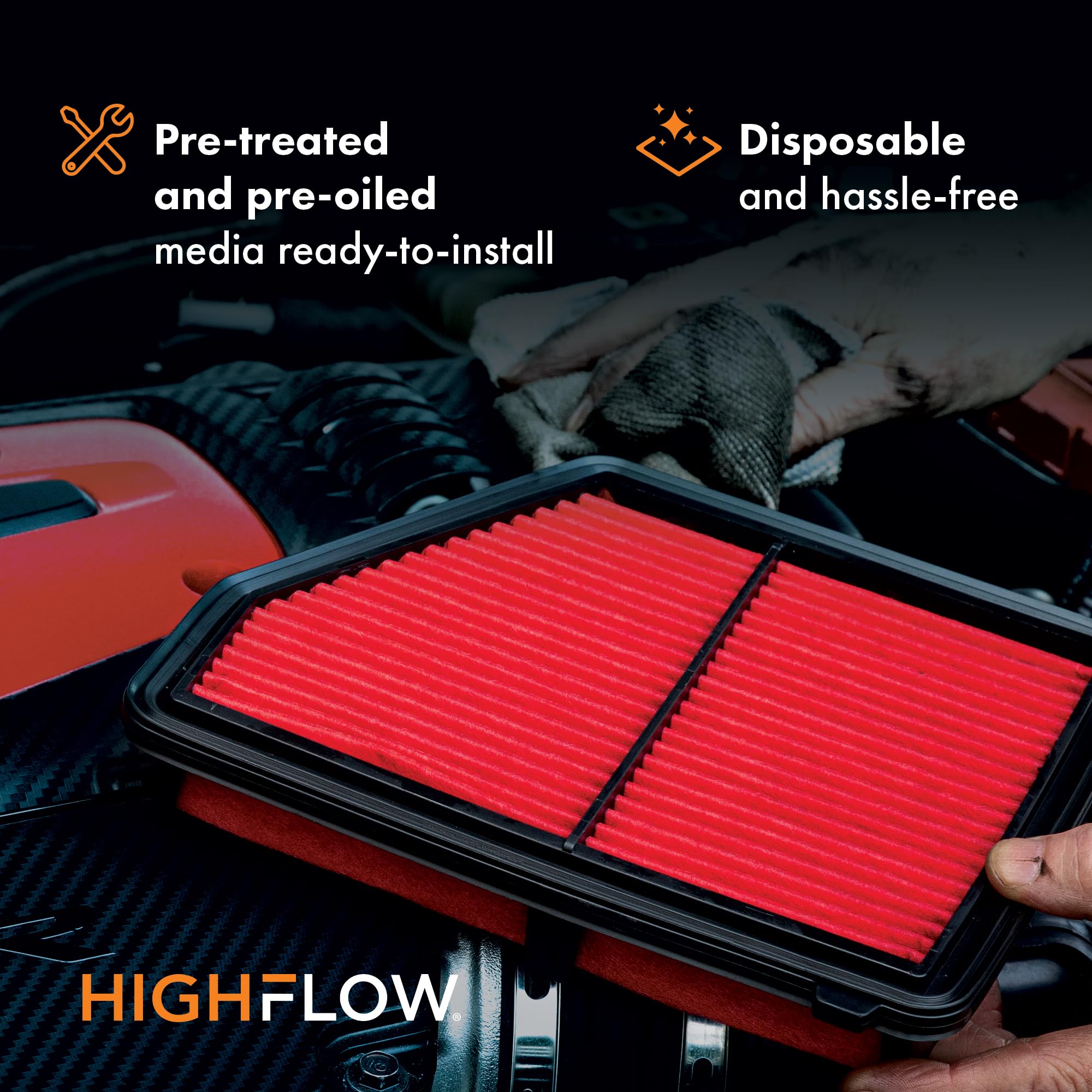 ULTIMATE PROTECTION – HIGHFLOW uses a premium pre-oiled media technology that has 2X greater dirt-blocking capacity than basic paper filters. Enhanced engine protection against air particles, with up to 99% cleaner air before reaching the car's engine