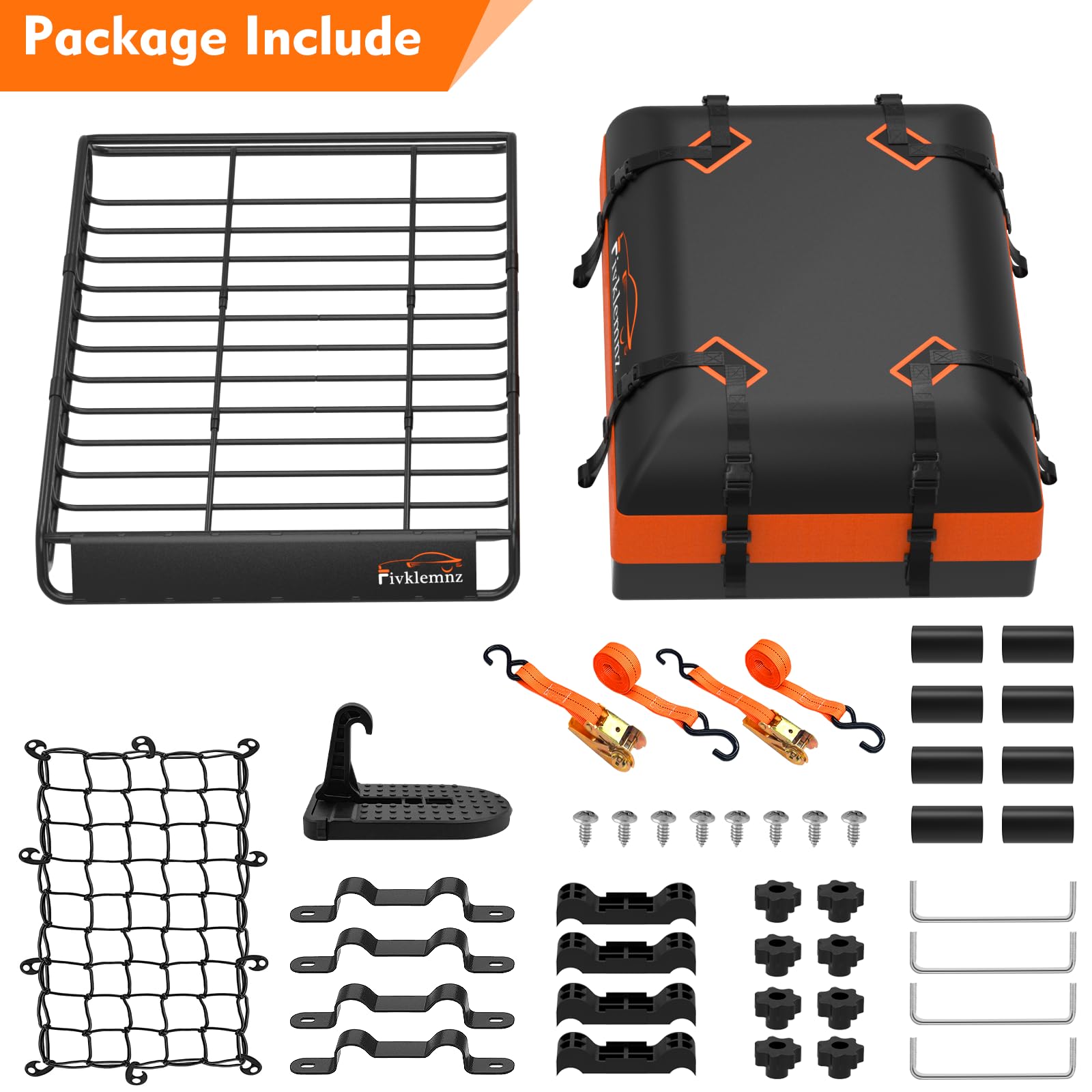 Easy to Assemble: The car roof basket can be assembled and mounted to the crossbar of your vehicle easily (you will need the crossbar to use this roof basket cargo rack). It includes a roof rack basket, a roof bag, a cargo elastic net, 2 ratchet straps and so on.
