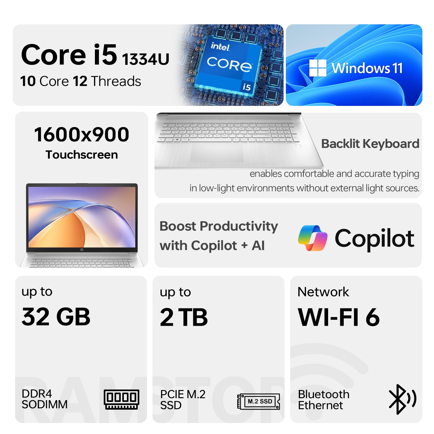 [Immersive 17.3" Touchscreen Display] The large HD+ 1600x900 touchscreen display provides comfortable viewing for spreadsheets, presentations, and streaming. The 60Hz refresh rate ensures smooth visuals during work or entertainment.