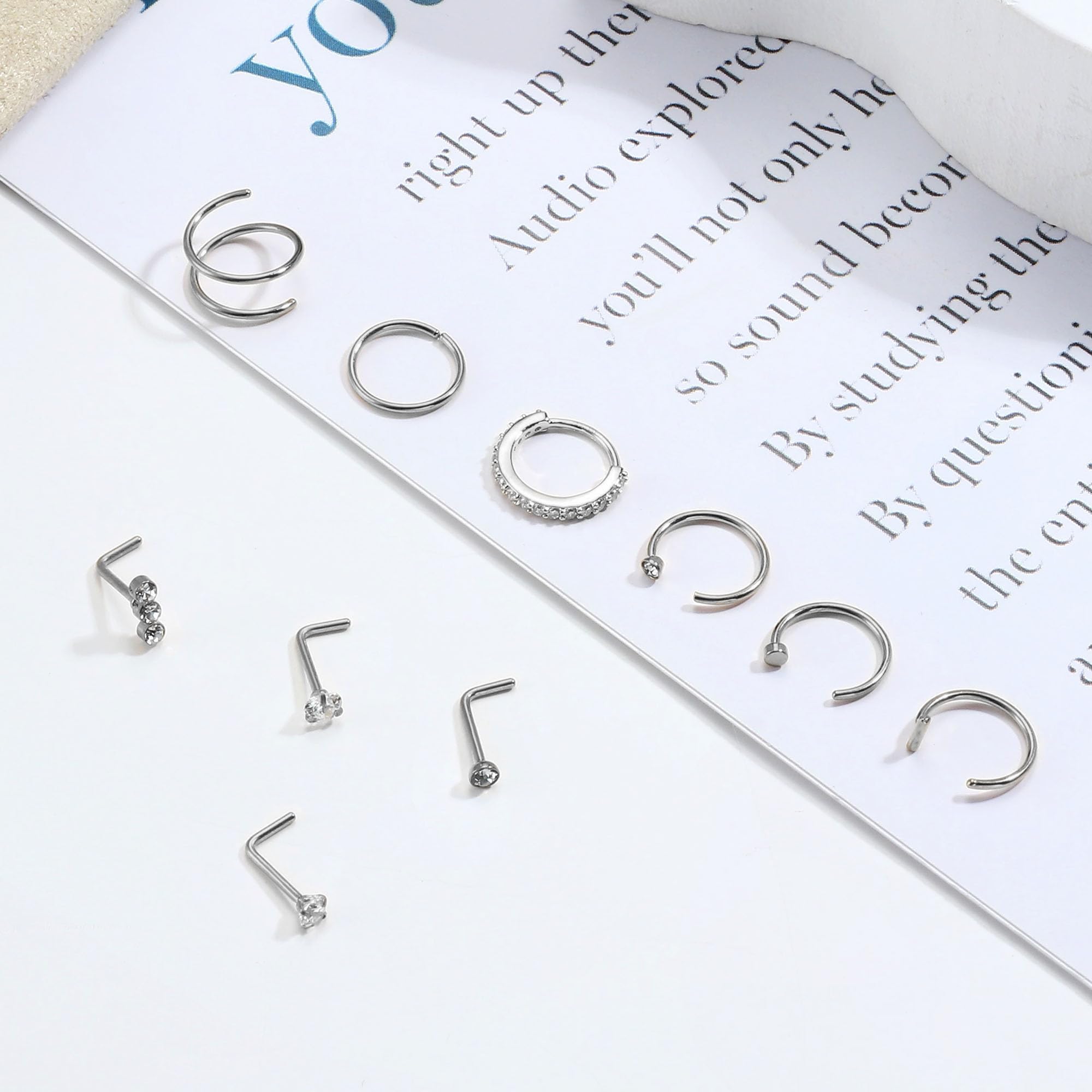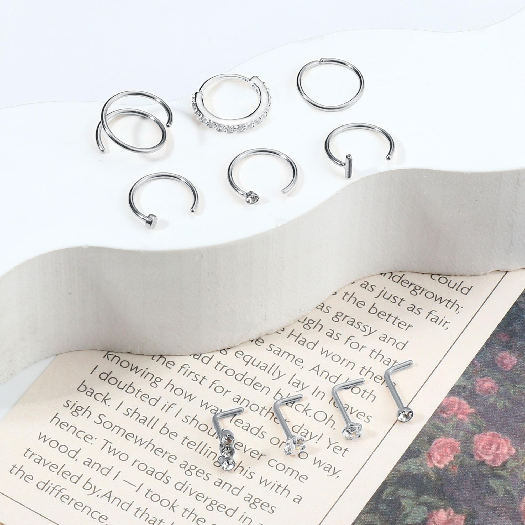 Classic Nose Rings Set: One order you will receive 10pcs nose ring, including 4pcs L shaped nose stud: round CZ/heart, 1pcs double nose ring for single piercing,and 5pcs hoop nose ring in different style. Nose piercings can give you multiple wearing choices as you like