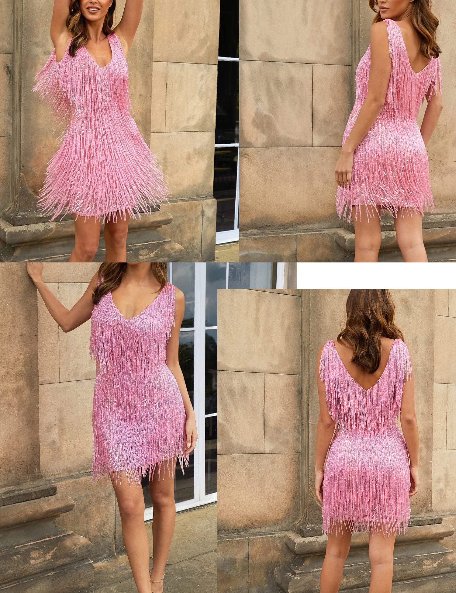 Natural waistline, tank top design, sleeveless, and tiered horizontal rows of fringe, A fantastic, elegant and stylish mini dress, Reminiscent of the roaring '21s.