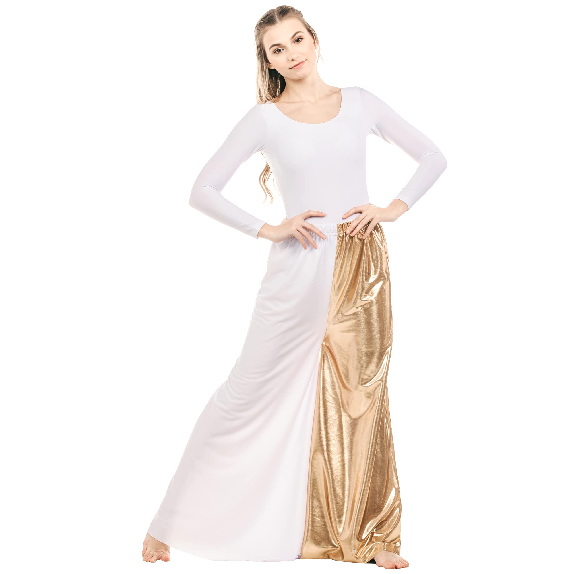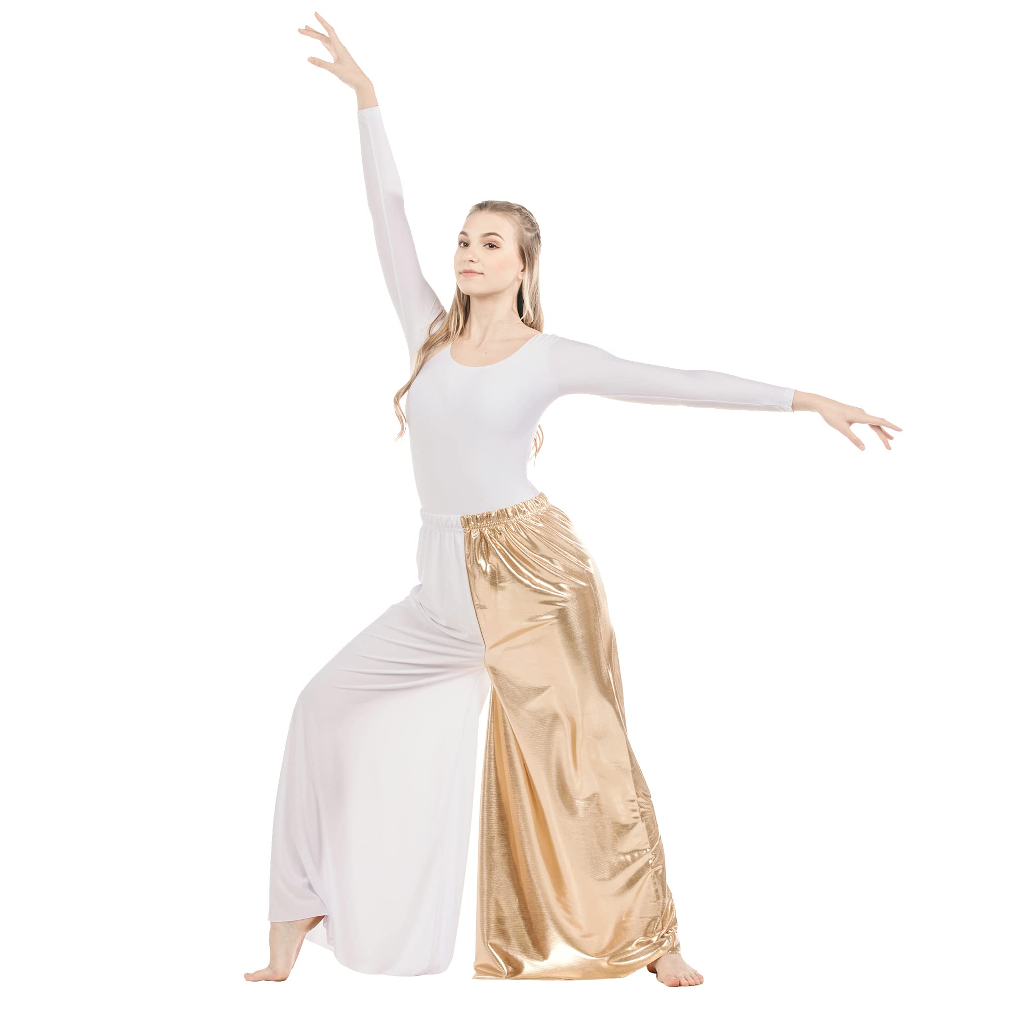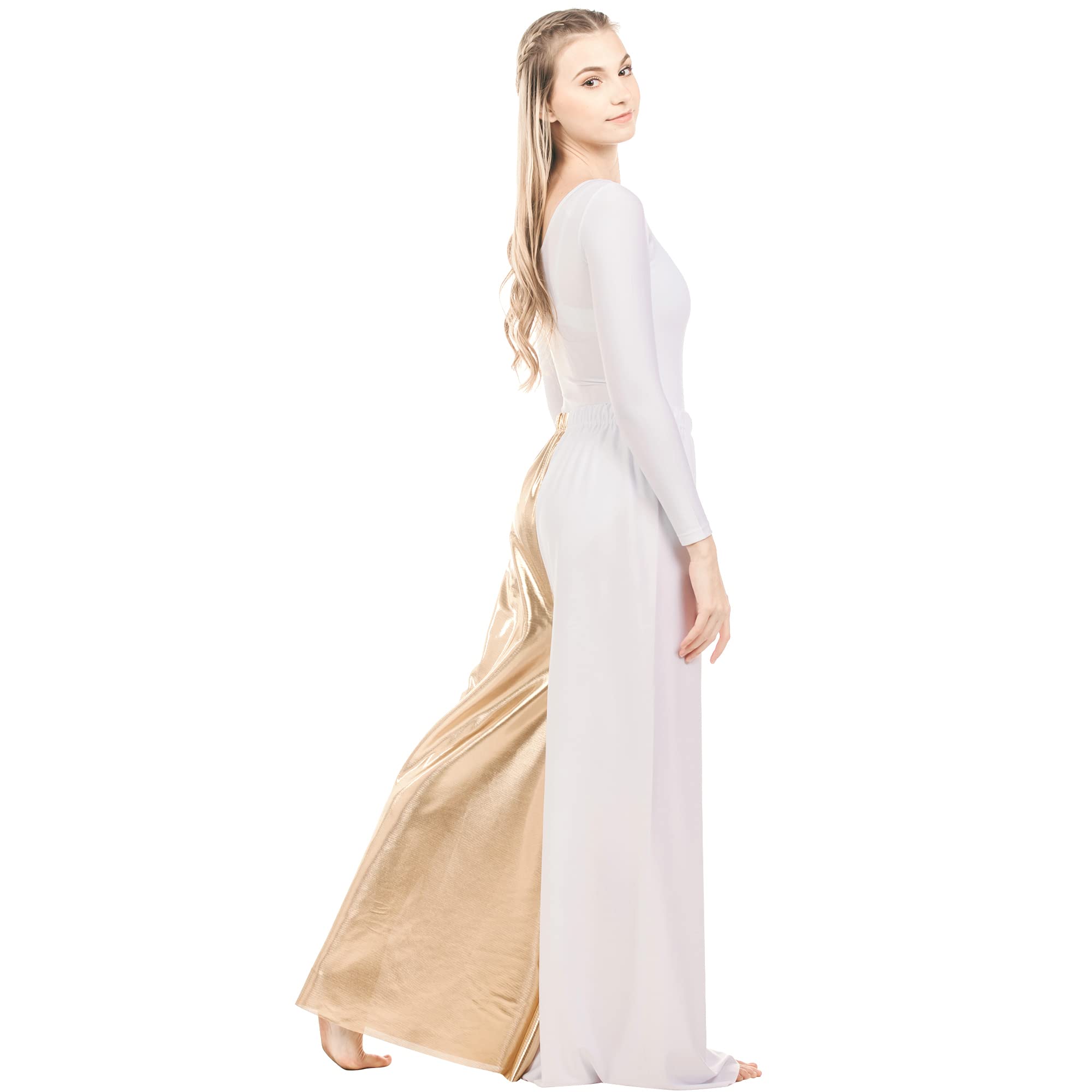 Description Palazzo pant is designed for dancers that perform spiritual or liturgical dancing. This pant features a loose and extra wide leg fit. The polyester/spandex fabric is smooth, soft, and moves easily when dancing. The elastic waistband design provides a comfortable fit and easy changing for performances. The palazzo pants are made in full length in order to fit the majority. But no need to worry about them being too long. You can easily cut to your size in length without a need for a hem as the material does not unravel or fray.