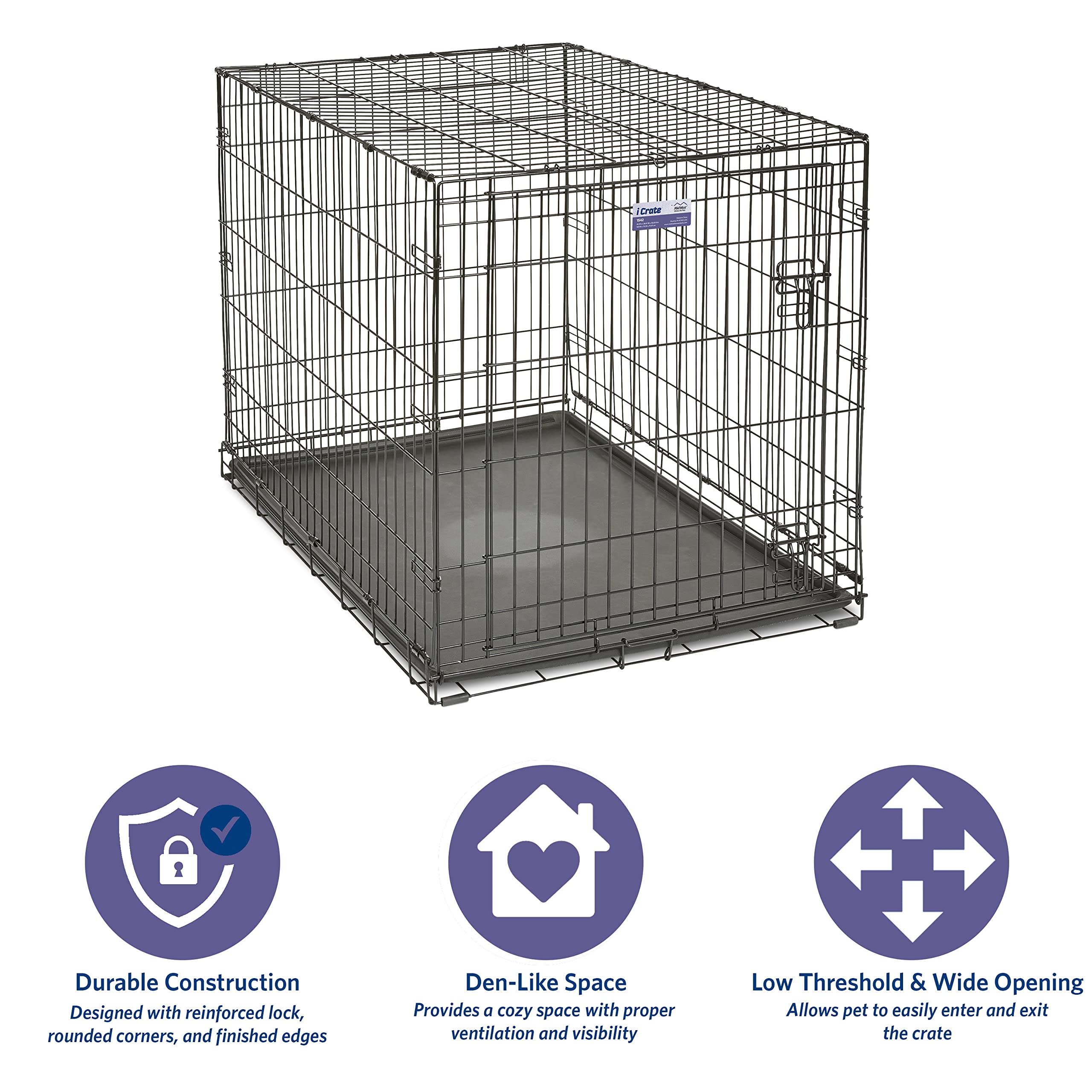 iCrate single door dog crate measures 42L x 28W x 31H inches and is suitable for large dog breeds with an adult weight of 70-90 pounds. If your dog’s weight or measurements are on the higher side for this crate, we recommend buying the next crate size up