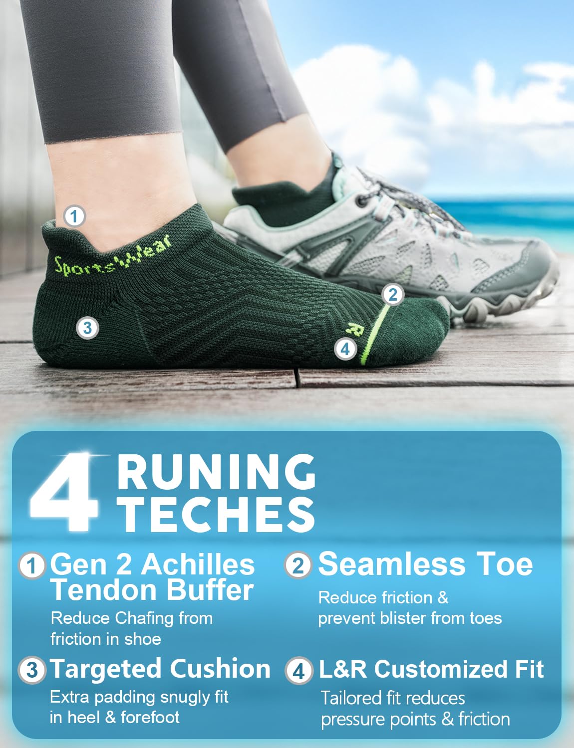 【Innovative Anti-Blister Design】: Engineered with reinforced padding at the heel and forefoot to protect against shoe friction. Includes seamless toe closure, targeted cushioning, ankle protector, and Achilles tendon buffer to prevent blisters and ensure a smooth, irritation-free run.