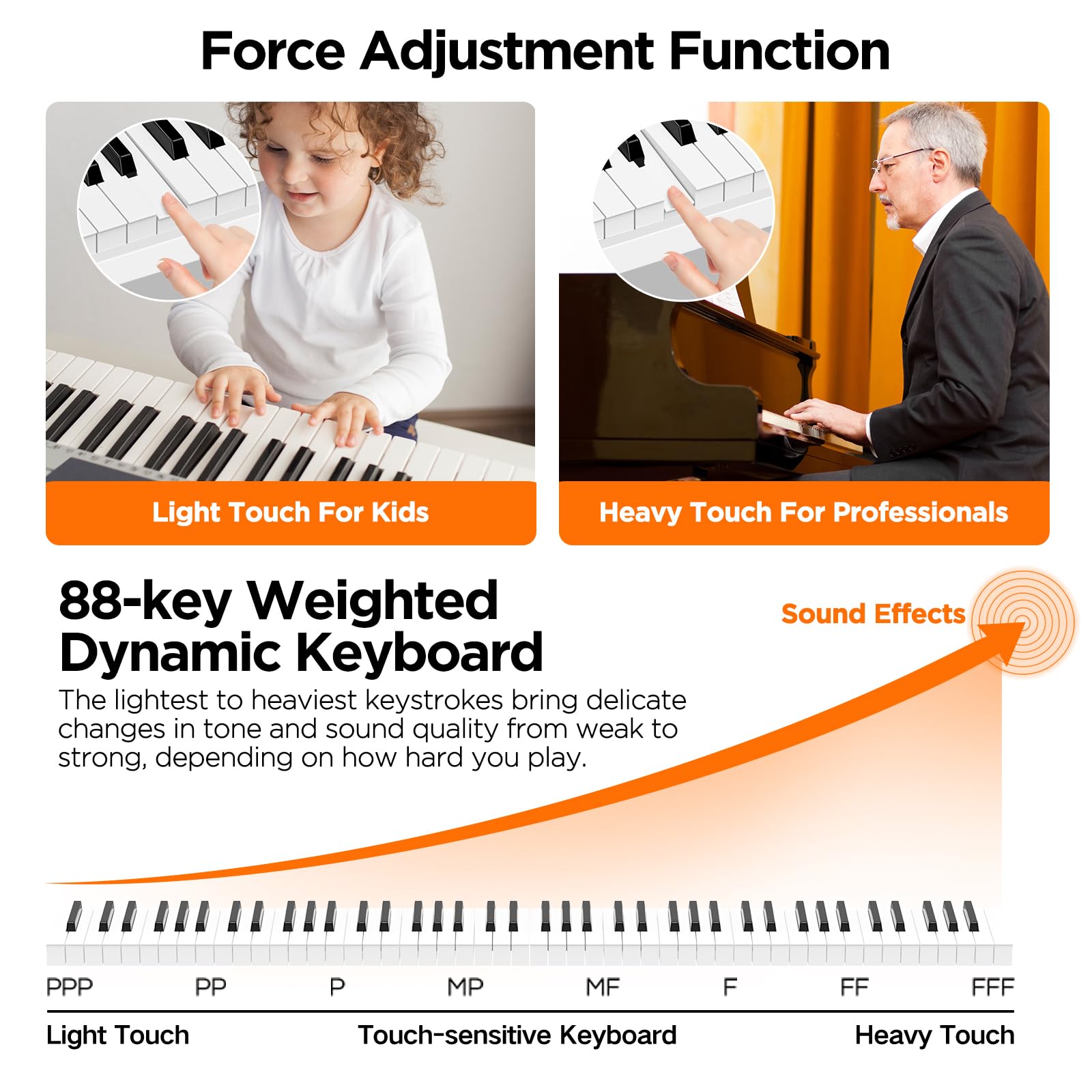 【88-Key Weighted Dynamic Keyboard with Adjustable Touch Sensitivity】Experience the feel of an acoustic piano with our 88-key weighted keyboard. It offers three sensitivity levels (light, medium, heavy) to match your playing style—whether you're a beginner, intermediate player, or professional musician. This ensures a responsive and authentic playing experience.