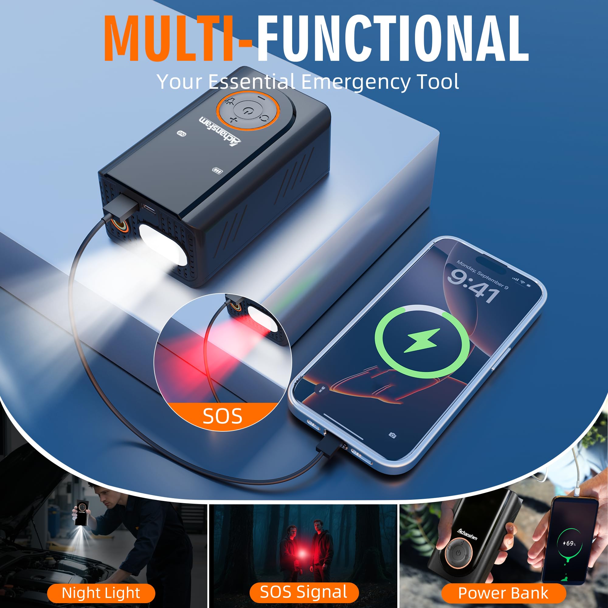 [๐๐๐ซ๐ฌ๐๐ญ๐ข๐ฅ๐ ๐๐ฌ๐] The mini air pump includes 4 interchangeable nozzles for car tires, bicycle tires, sports balls, and household inflatables. A built-in LED light with three modes (steady, SOS, strobe) enhances visibility and safety, making it a reliable tool for both day and night use.