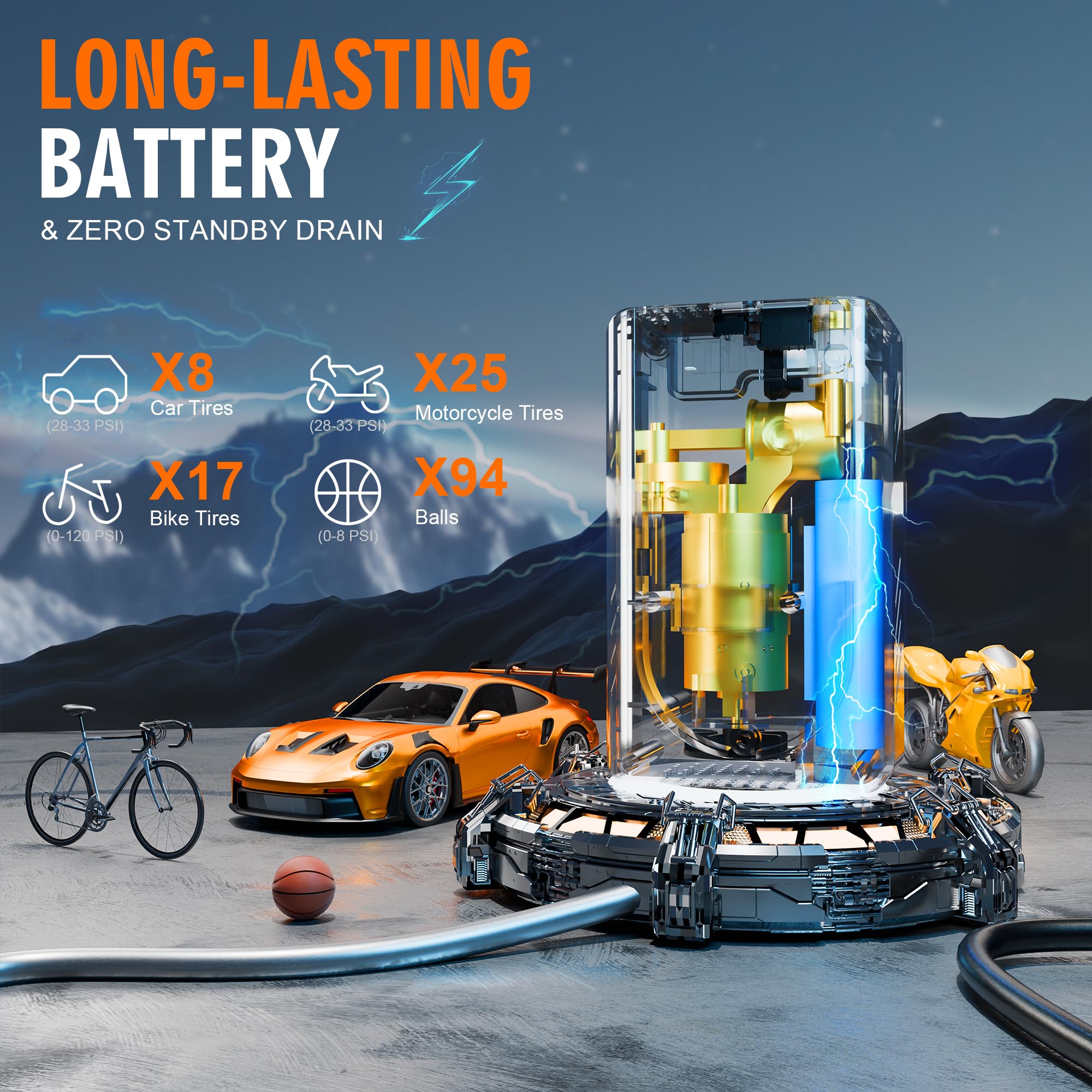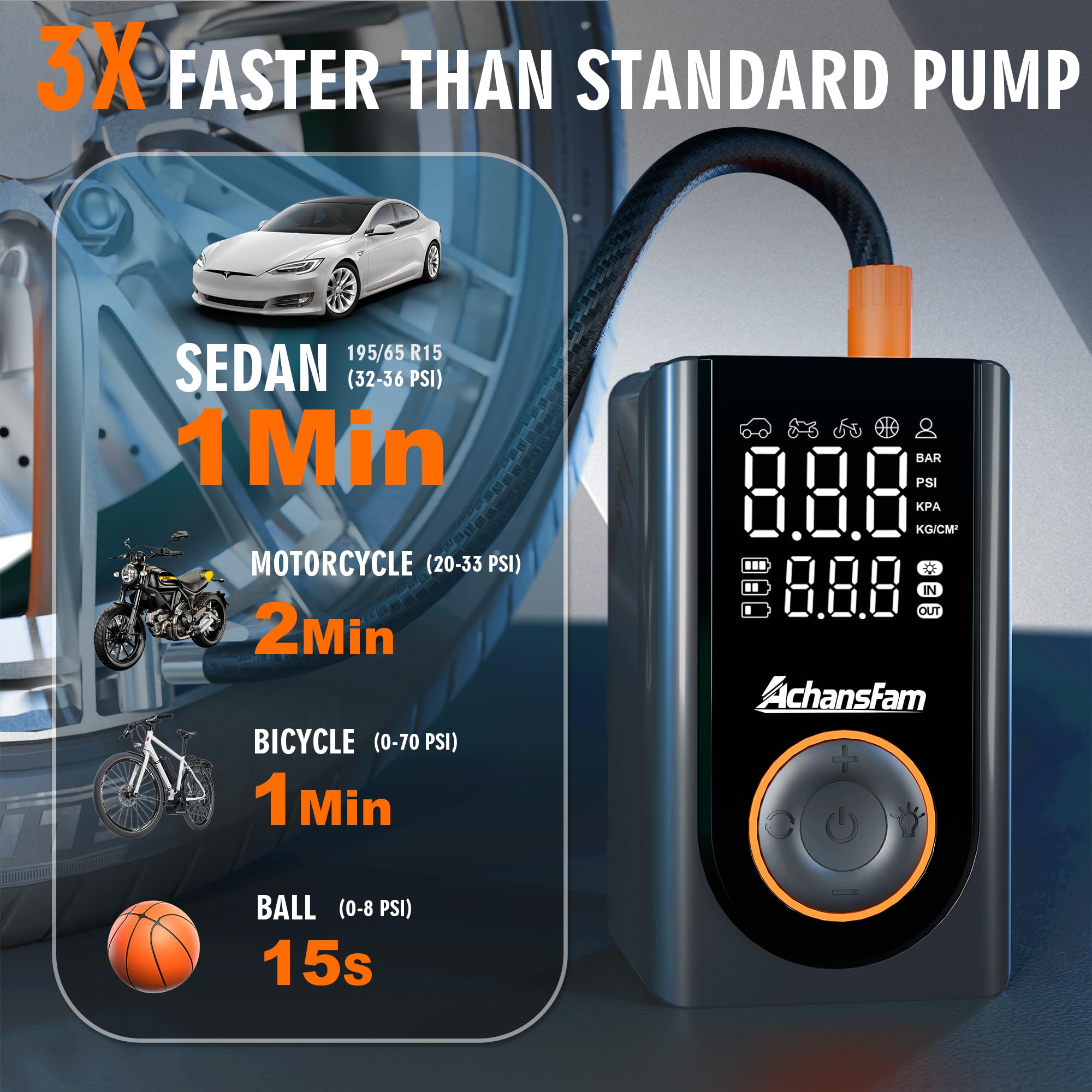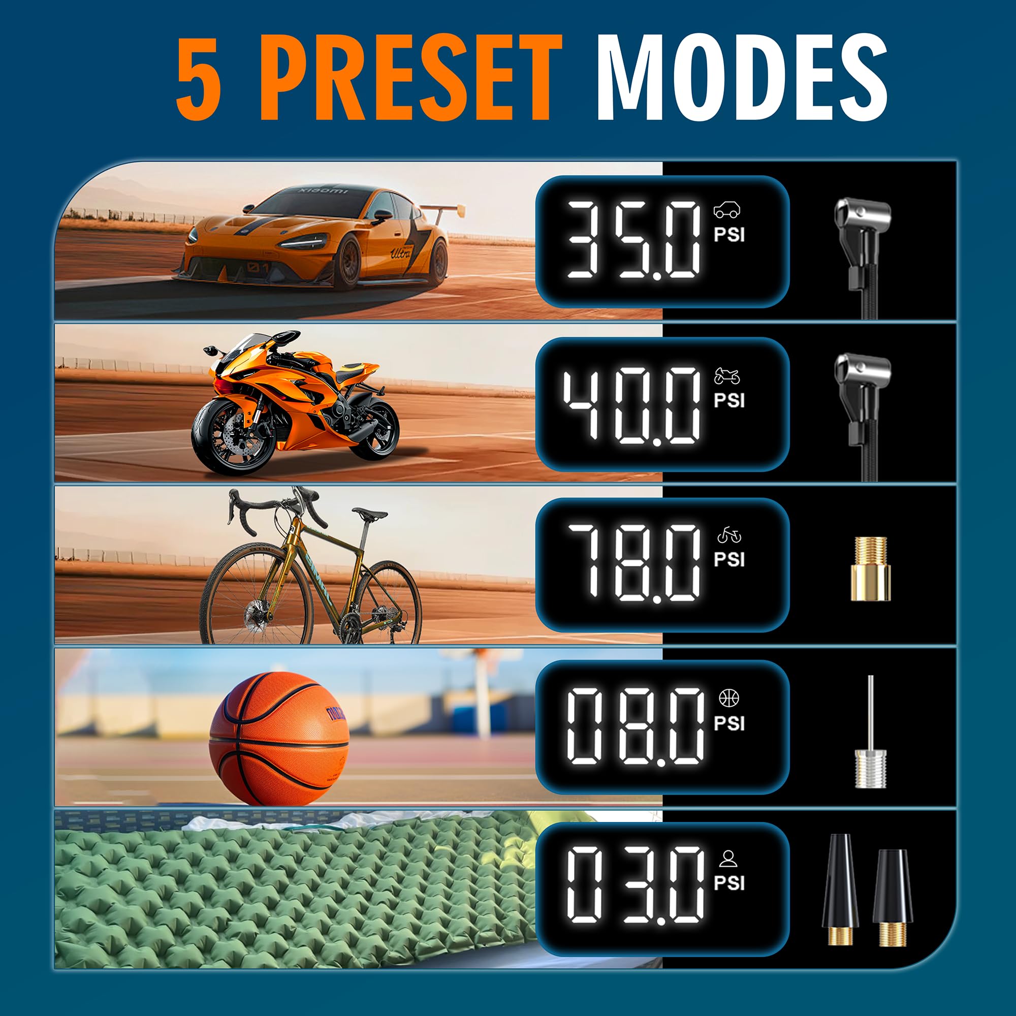 [๐๐ฆ๐๐ซ๐ญ & ๐๐๐๐] The pumpโs digital gauge offers five modesโCar, Motorcycle, Bicycle, Ball, and Custom. Simply select the right mode, and the auto-stop function delivers safe, accurate inflation while preventing over-inflation.
