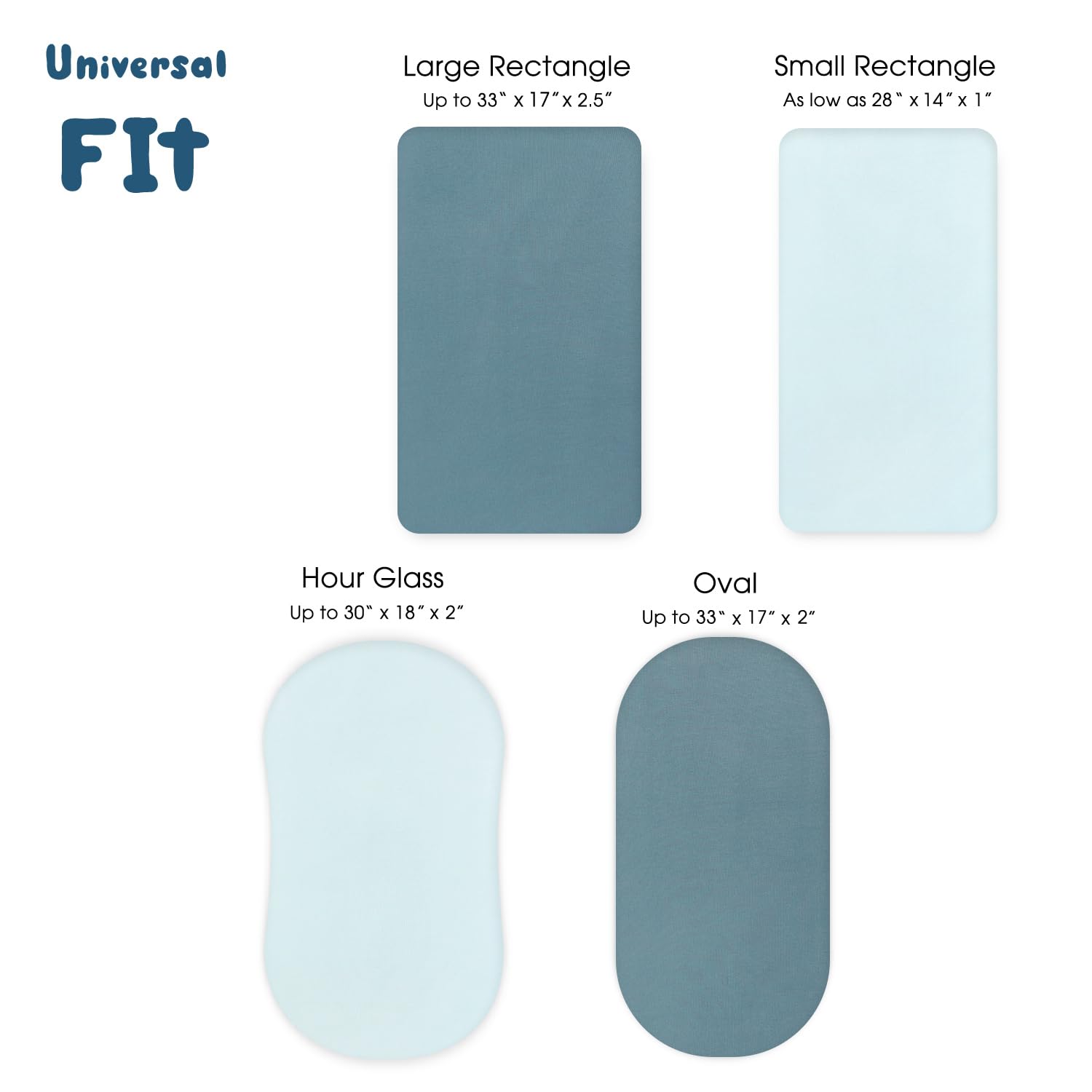 Universal Fit – Measuring 32" x 16" x 5". Our bassinet sheets fit almost all standard oval, round, rectangle, hourglass shaped bassinet mattresses and changing pads. Each bassinet mattress pad cover comes with an elastic band encased at the bottom for safety.