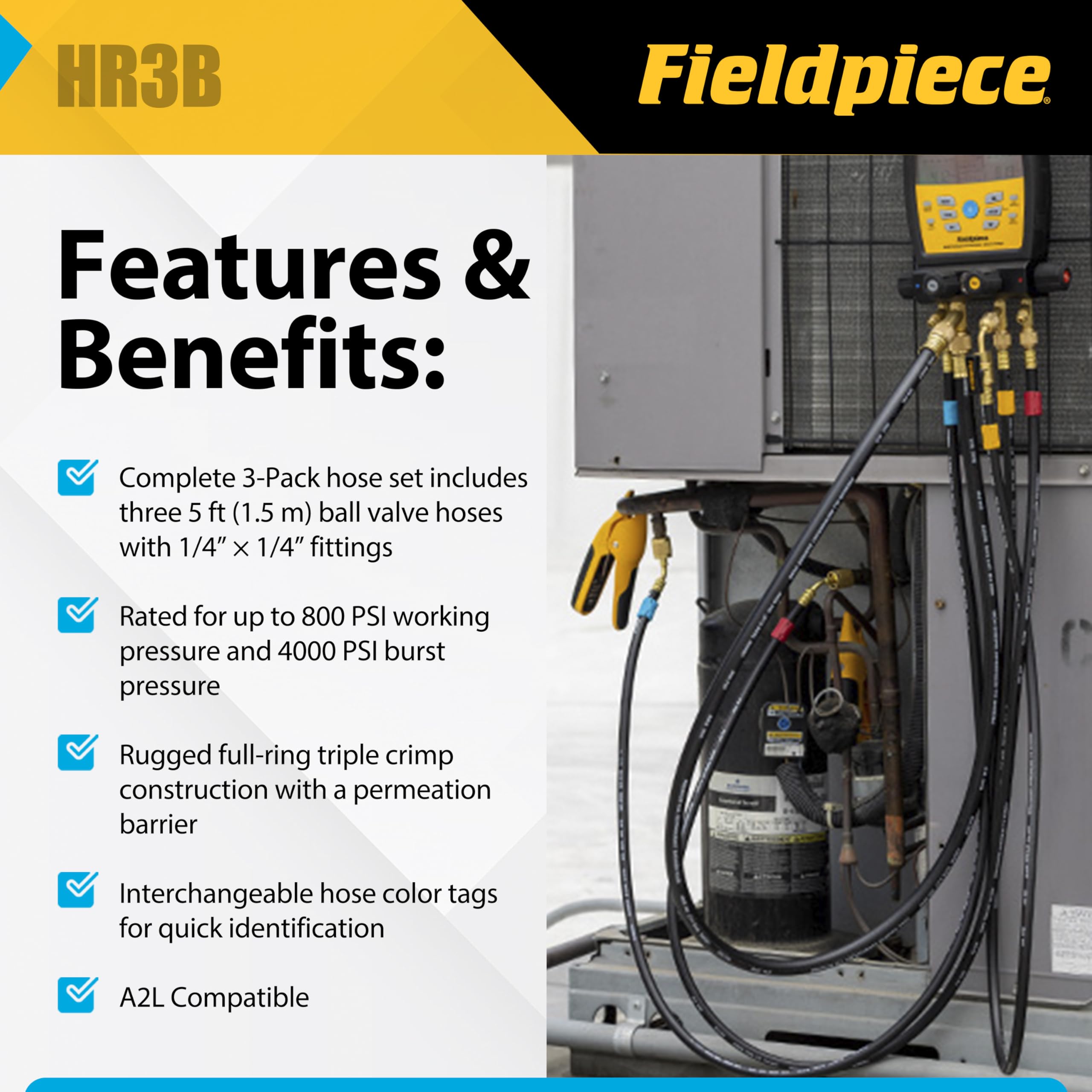 High-Pressure Performance – Rated for up to 800 PSI working pressure and 4000 PSI burst pressure, giving HVAC technicians confidence and safety on demanding servicing jobs