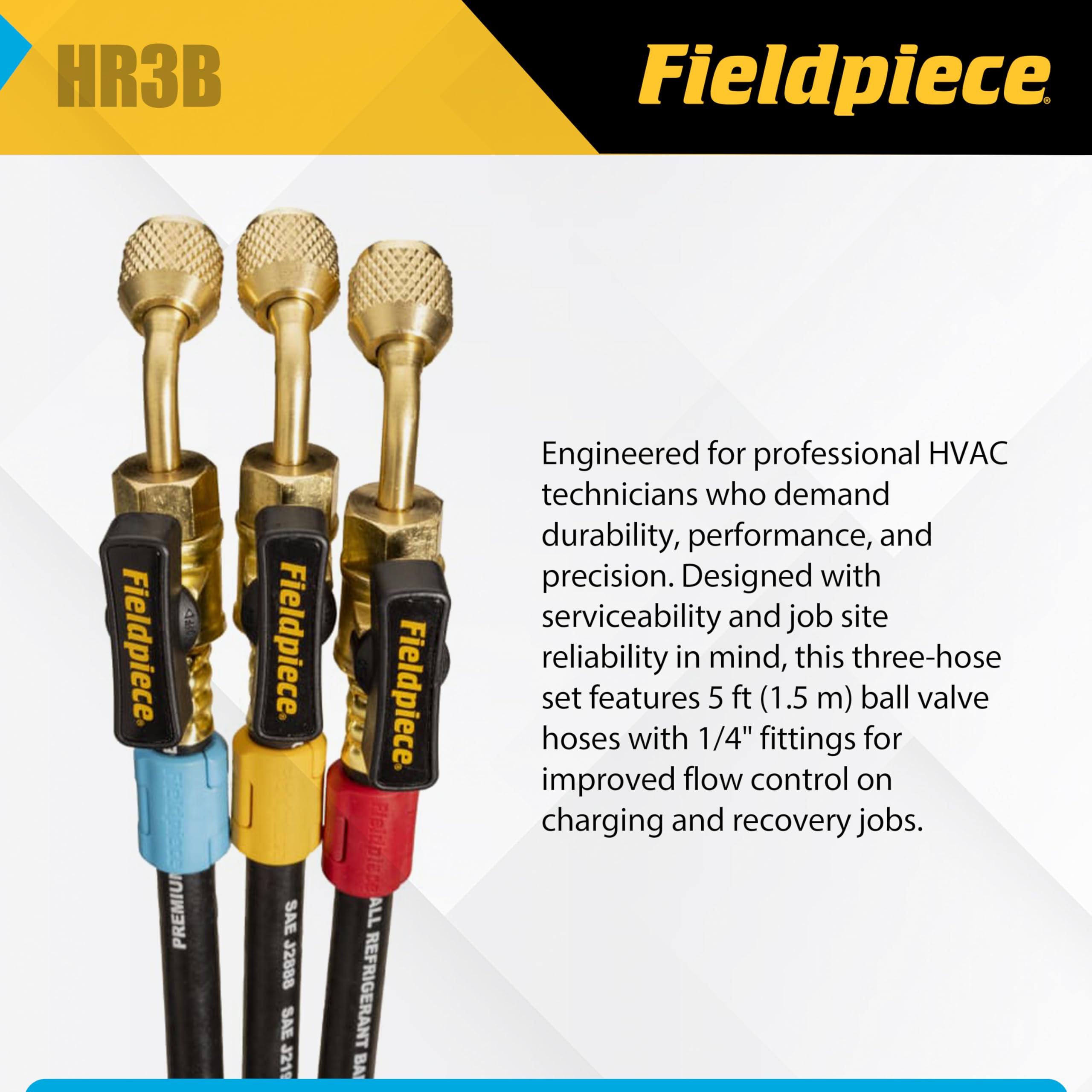 Complete 3-Pack Hose Set for HVACR Jobs – Includes three 5 ft (1.5 m) ball valve hoses with 1/4″ × 1/4″ fittings — ideal for charging, recovery, and refrigerant handling tasks