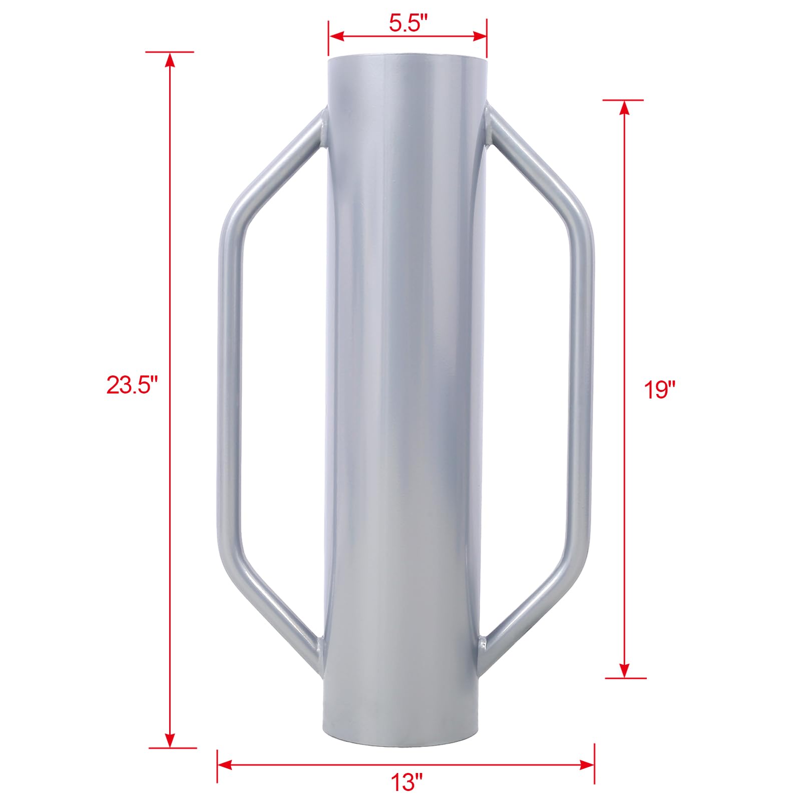 Specifications: Main Color: Grey Main Material: Steel Product Dimensions: Assembled Length (in.):23.50 Assembled Width (in.):13.00 Assembled Height (in.):5.50 Weight (lbs.):30.00 Overall Height: 23.5in * Width: 13in Outer Pipe Diameter: 5.5in, Inner Pipe Diameter: 5.1in Package includes: 1 x Iron Fence Post Driver Notice: The color of the actual product may differ from the image due to the lighting or the monitor’s display. Manual measurement has been used, there may be some reasonable error.