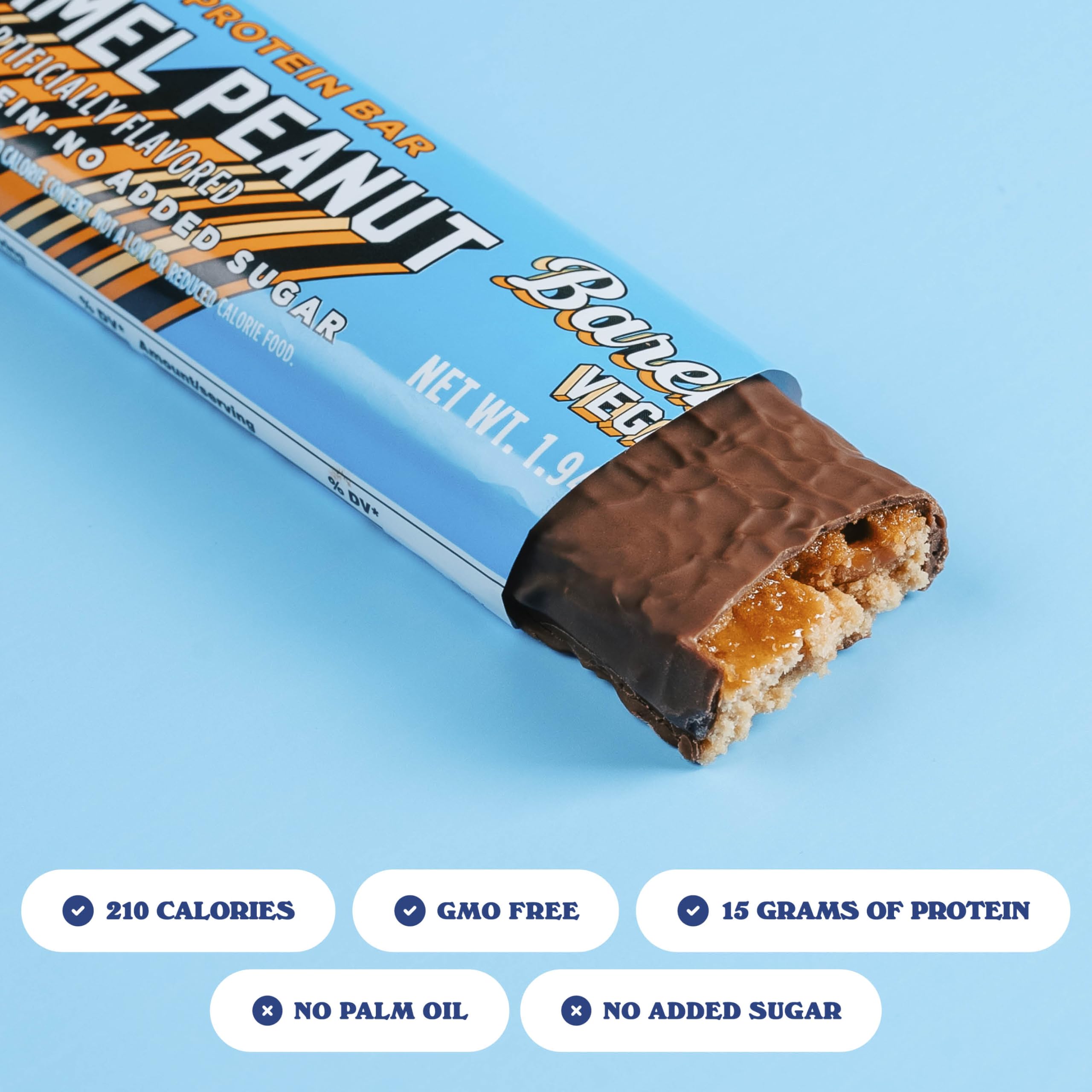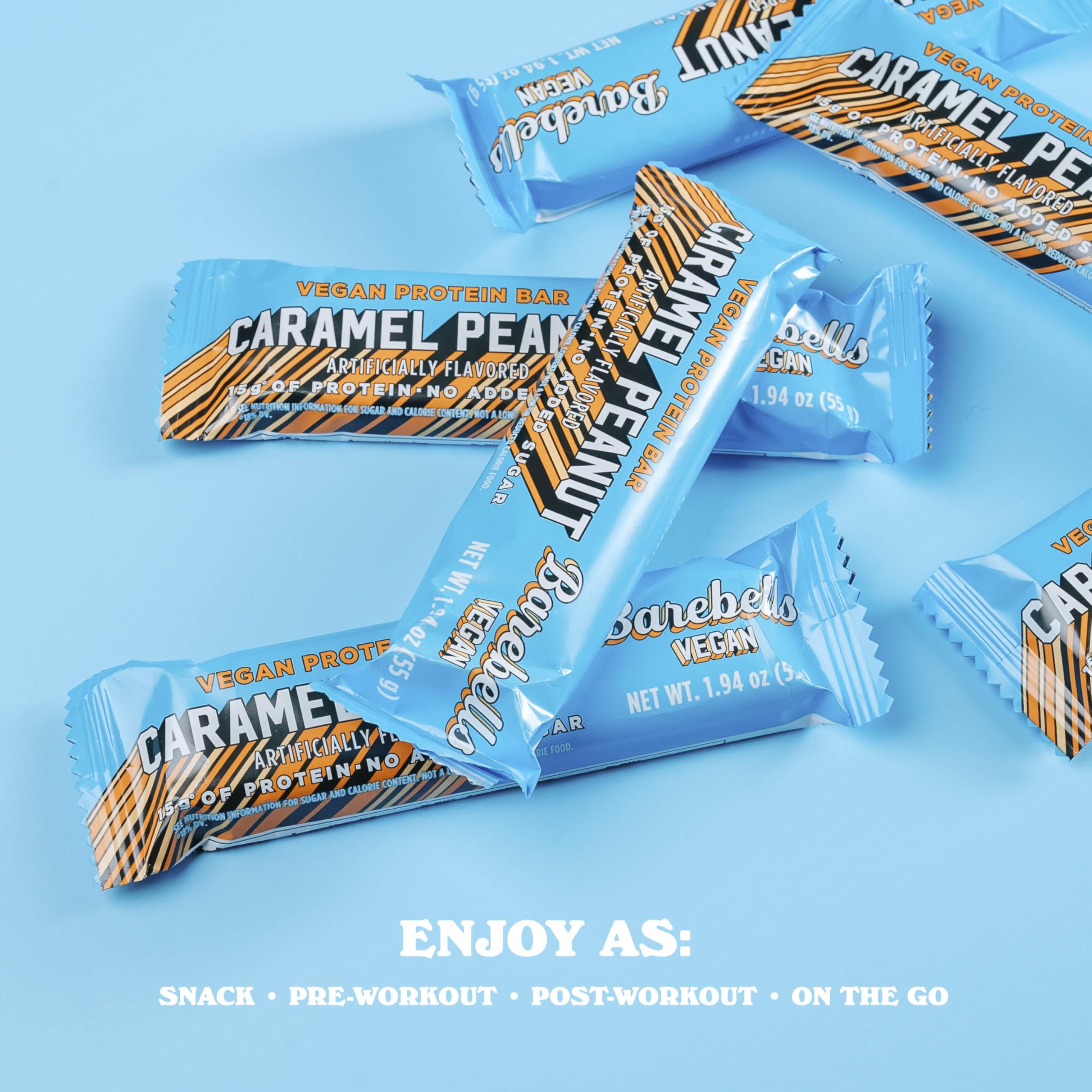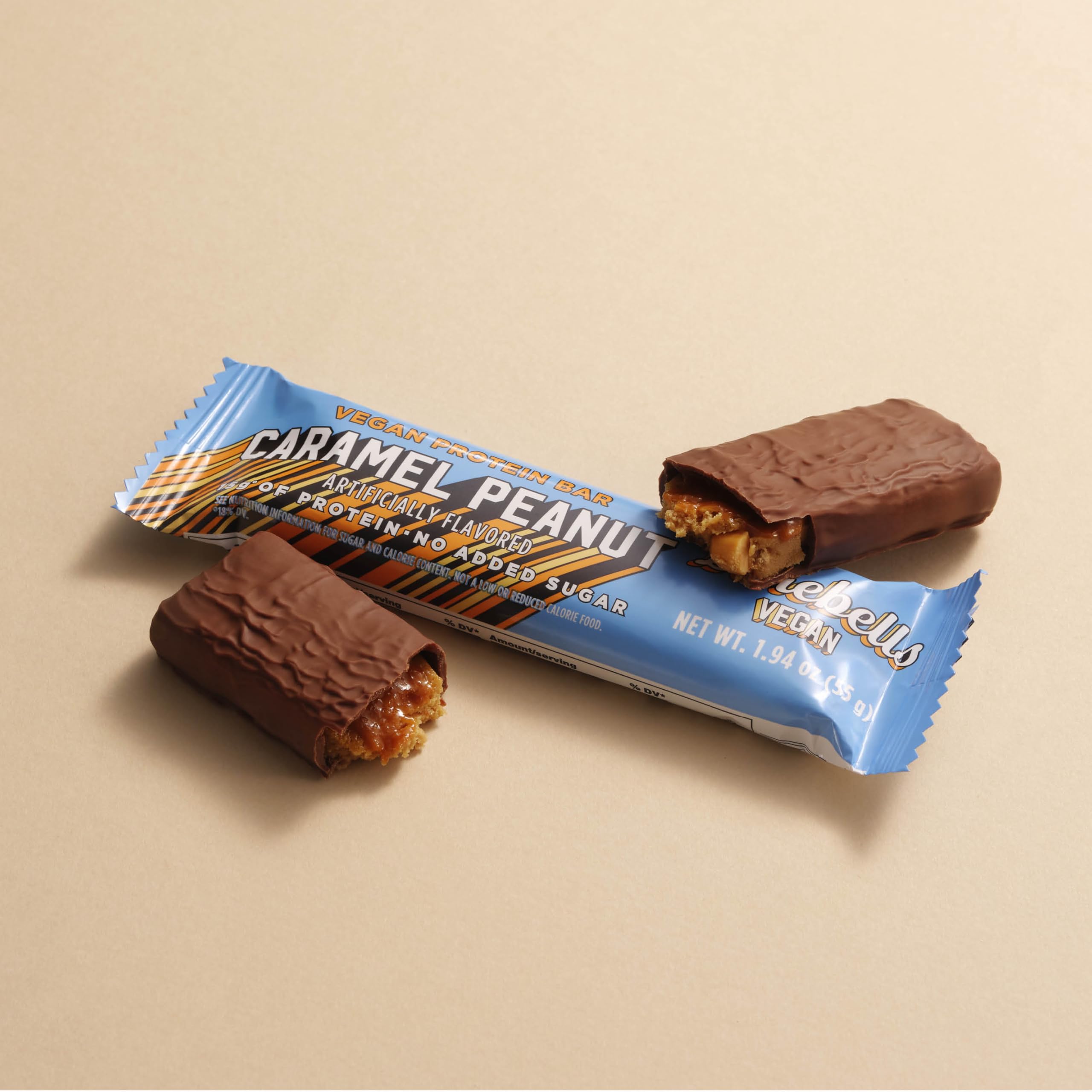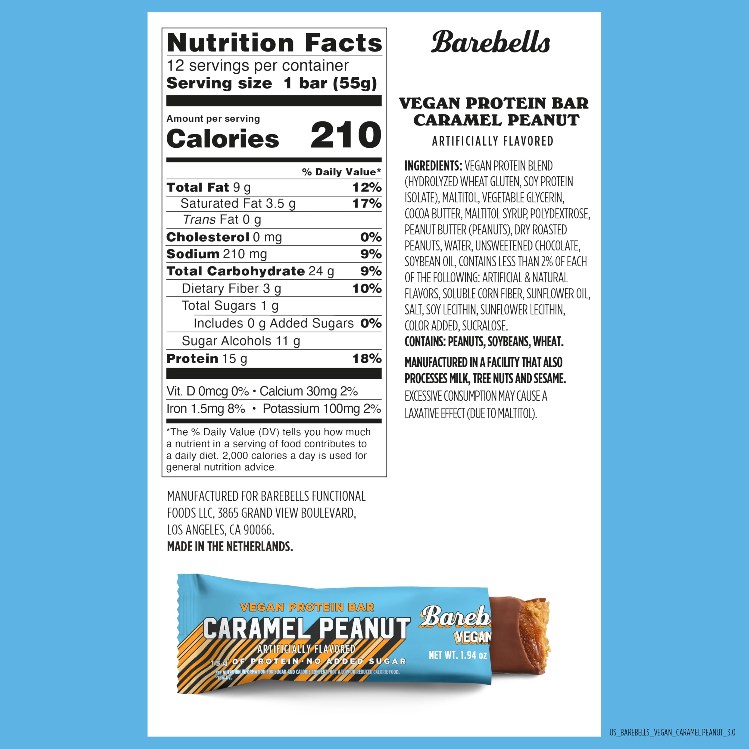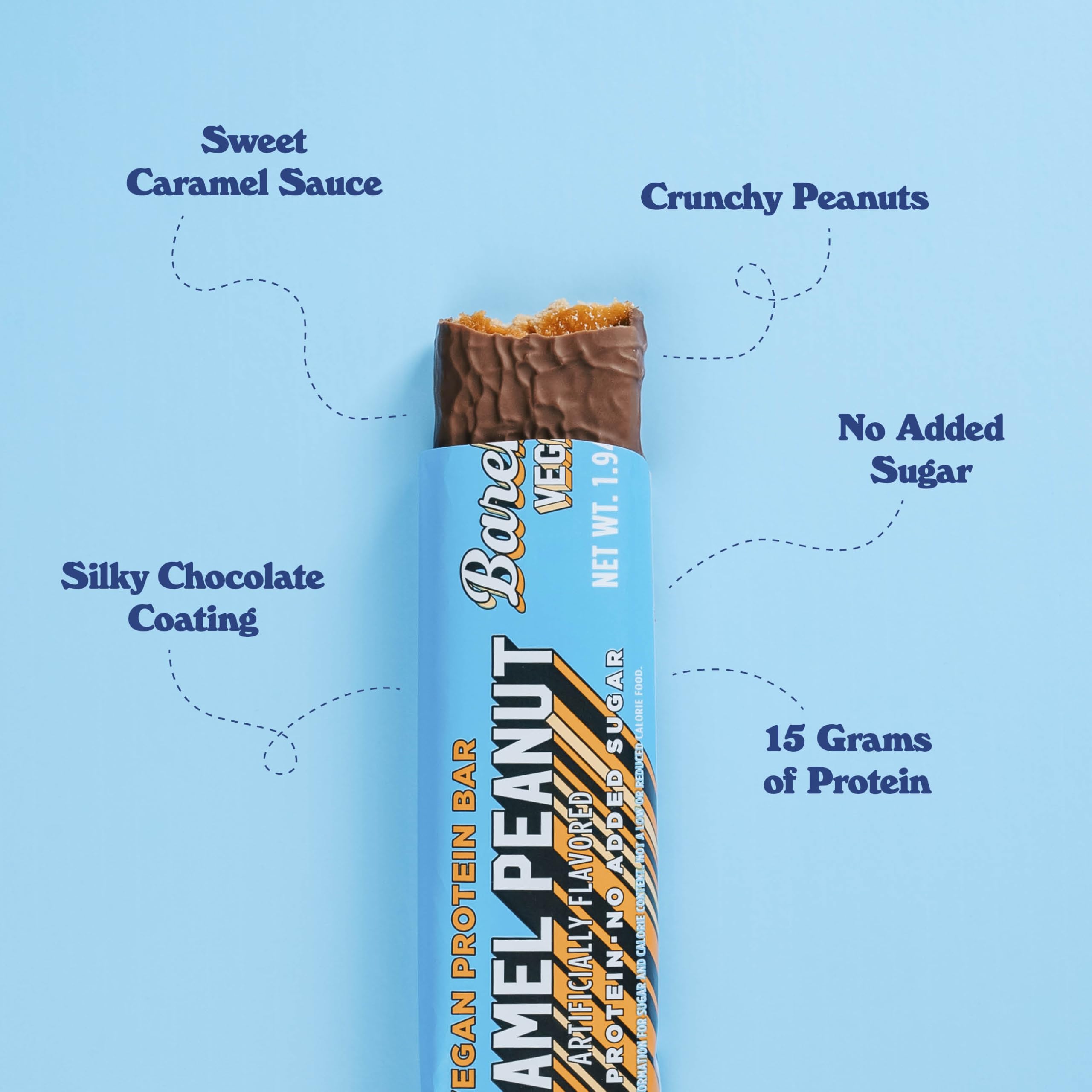 BAREBELLS PLANT BASED PEANUT CARAMEL PROTEIN BAR - 12 individual yummy Barebells protein bars! Tired of eating bars that taste like cardboard? Our latest Vegan Bar features a delicious combination of sweet caramel and crunchy peanuts. Each one of these Plant Based bars boasts 15g of plant-based protein derived from soy, peas, and rice. They have *no added sugar, are free from Palm Oil, and just 210 calories