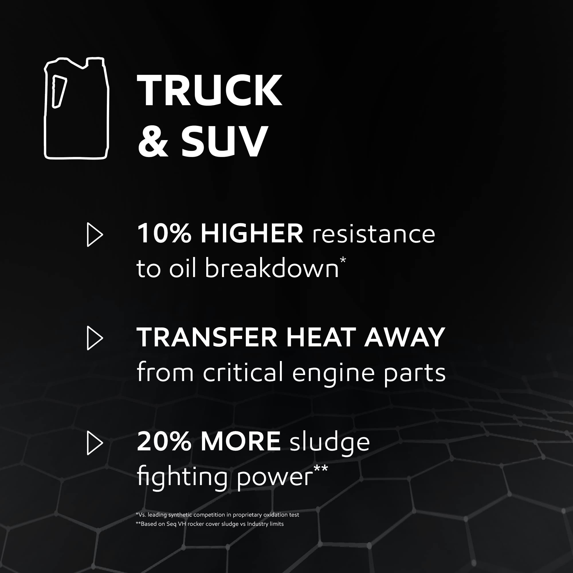 You count on your gas-powered truck or SUV for more than just transportation. For a motor oil that works as hard as you do, you can trust Mobil 1 Truck & SUV full-synthetic motor oil 5W-30. Mobil 1 Truck & SUV utilizes Mobil 1’s signature Triple Action Formula to deliver outstanding engine protection and cleanliness to your engine for up to 10,000 miles between oil changes,* and proven performance in a 10,000 lb. towing test.** Mobil 1 Truck & SUV full-synthetic motor oil 5W-30 is also 10% more resistant to oil breakdown*** and meets ILSAC GF-6 standards to help provide low-speed pre-ignition (LSPI) and timing chain wear protection while keeping your engine clean and helping your fuel economy. Mobil 1 is America’s #1 selling synthetic motor oil brand at retail,**** trusted recommended by car builders and experienced mechanics, and is the Official Motor Oil of NASCAR®. (*Protects for up to 10,000 miles or 1 year, whichever comes first. To learn more about the Mobil 1 Limited Warranty, visit Mobil.US. **Please reference your vehicle owner’s manual for information on your engine’s maximum towing / hauling capacity. ***Versus leading synthetic competitors in proprietary oxidation test. ****Source: The NPD Group/ Retail Tracking Service/ Dollar Sales/ PCMO full-synthetic/ 52 weeks ending September 30, 2023)