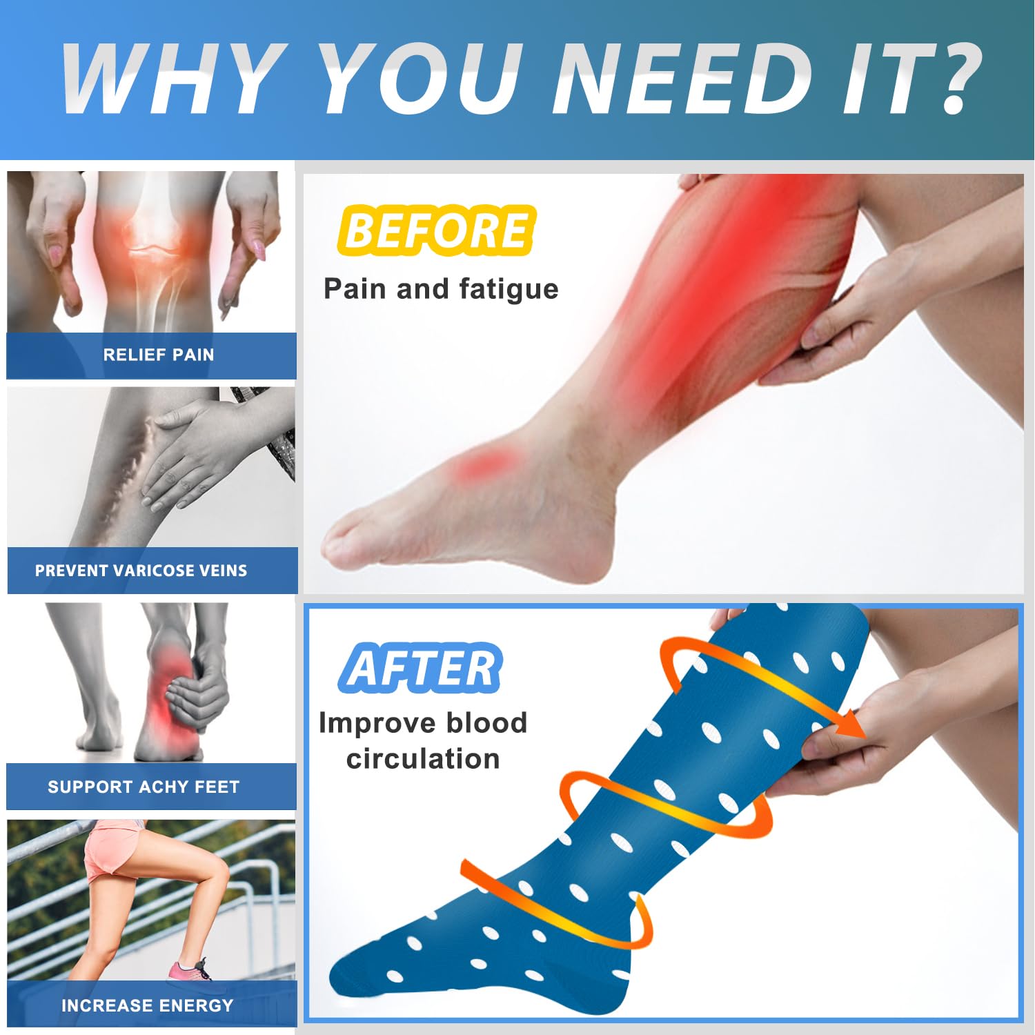 🆕【ENERGIZE YOUR LEGS】-- Compression socks have been shown to help decrease swelling and pain in the legs and ankles. Graduated compressions' whole purpose is to increase circulation, thus improving sports levels in the body. Another benefit of improving circulation is decreasing swelling and fluid retention. Increased circulation decreases swelling and increases blood flow, this reduces the feeling of heavy and achy legs.