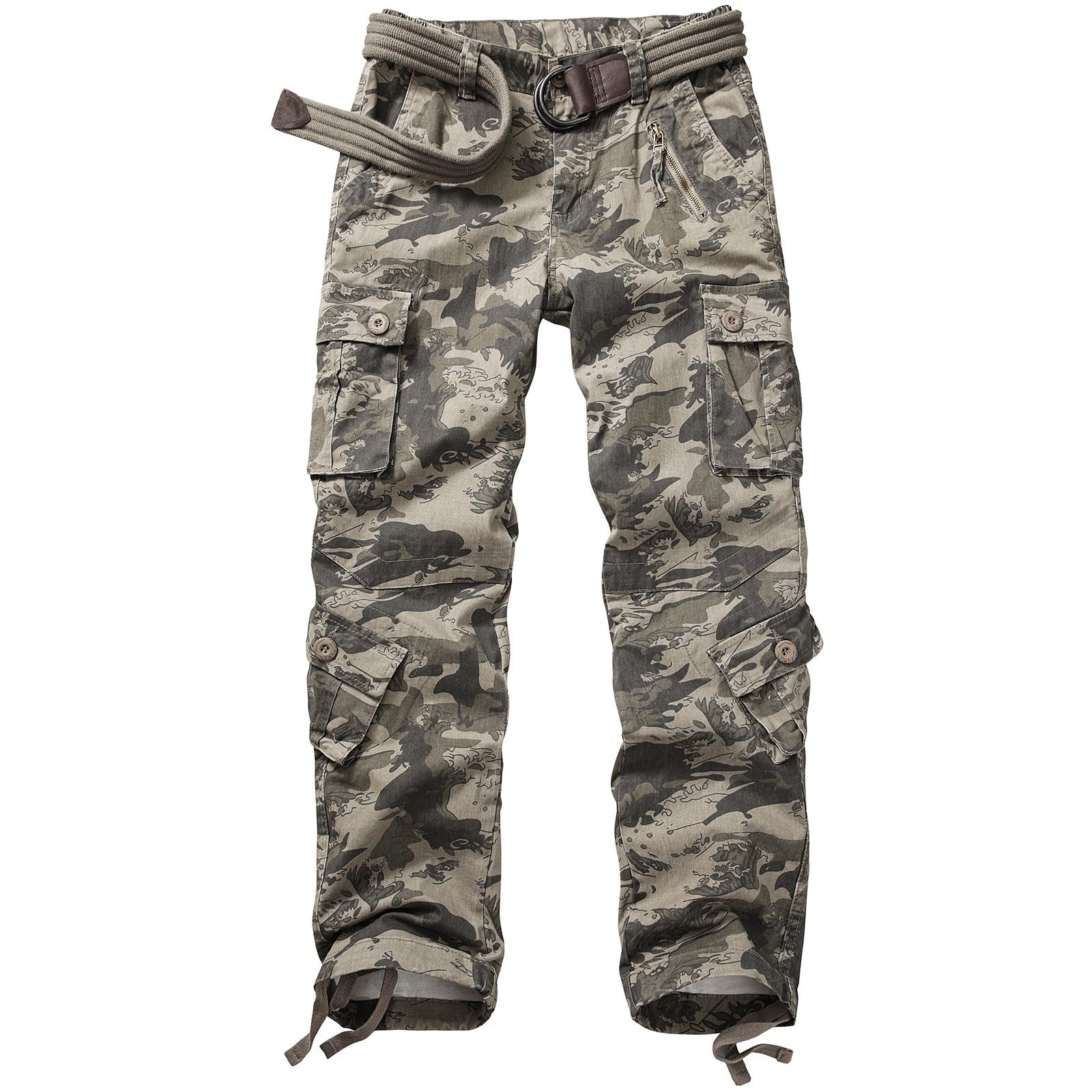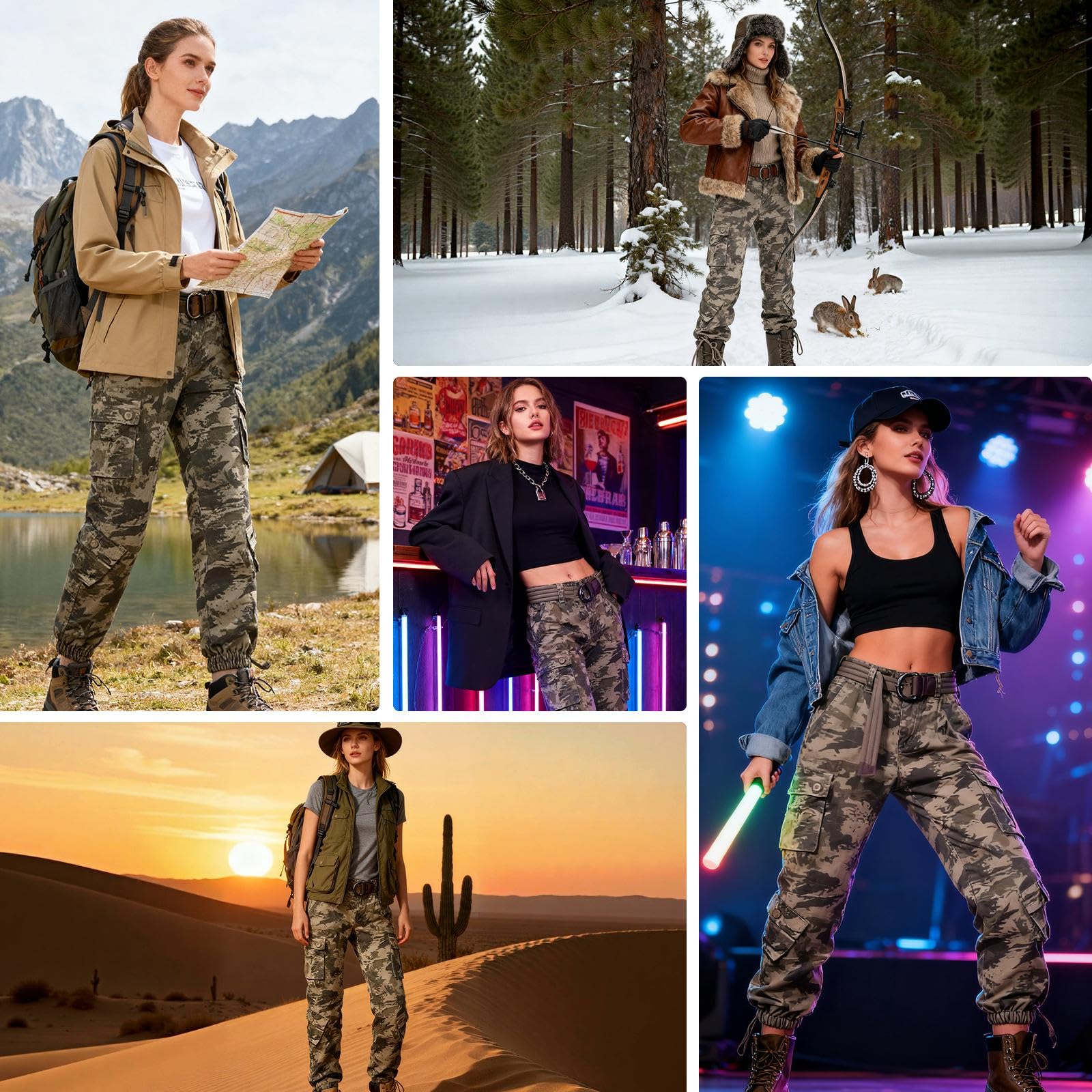 Womens Cargo Pants with Multi Pockets: Camo pants women features 9 Pockets including 2 front slash pockets, 2 buttoned cargo pockets, 2 calf pockets, 2 rear buttoned pockets, and 1 left front zipper pocket for safely storing your phone, keys, cards, tools, and other personal belongings. More practical—keep necessities arranged when traveling!