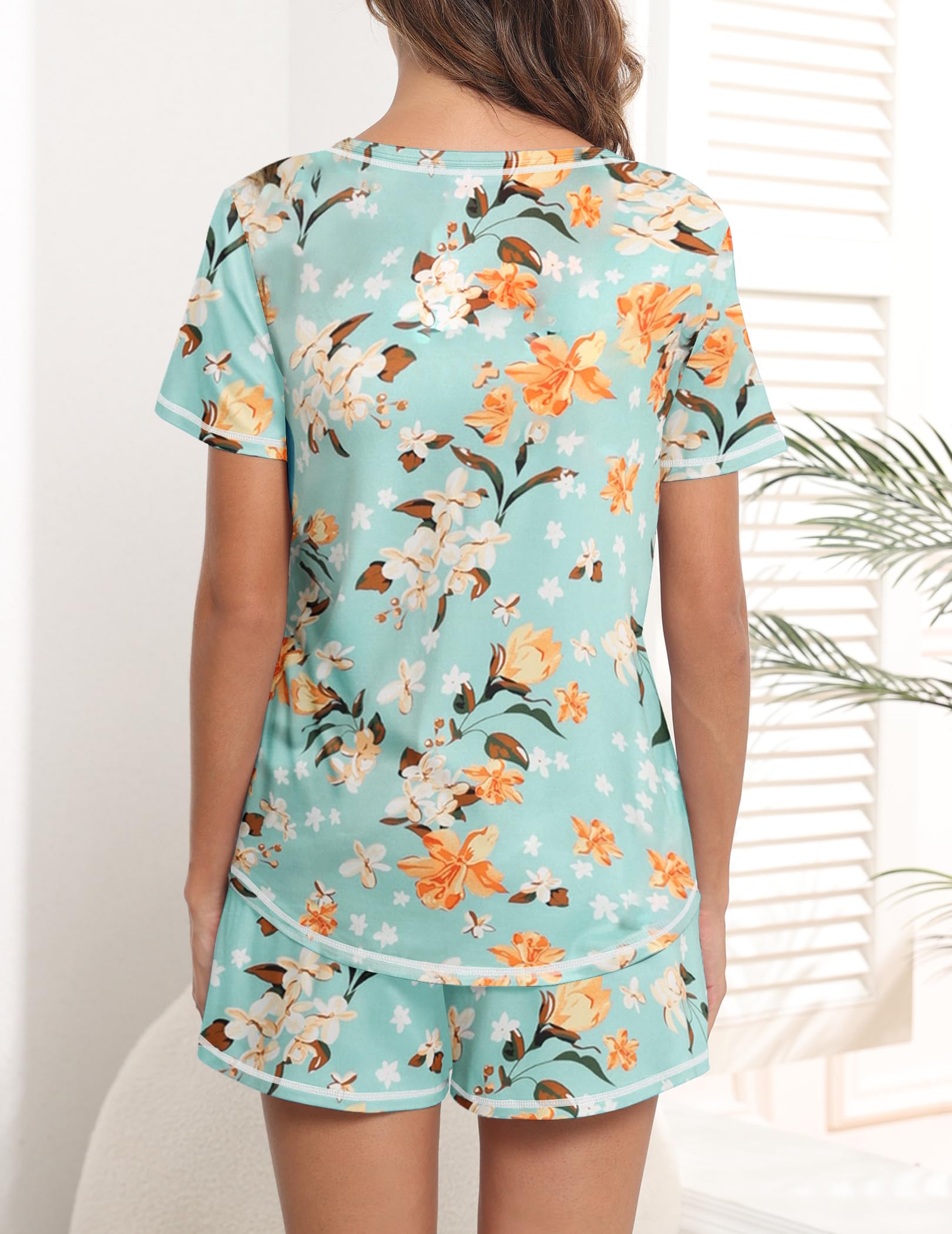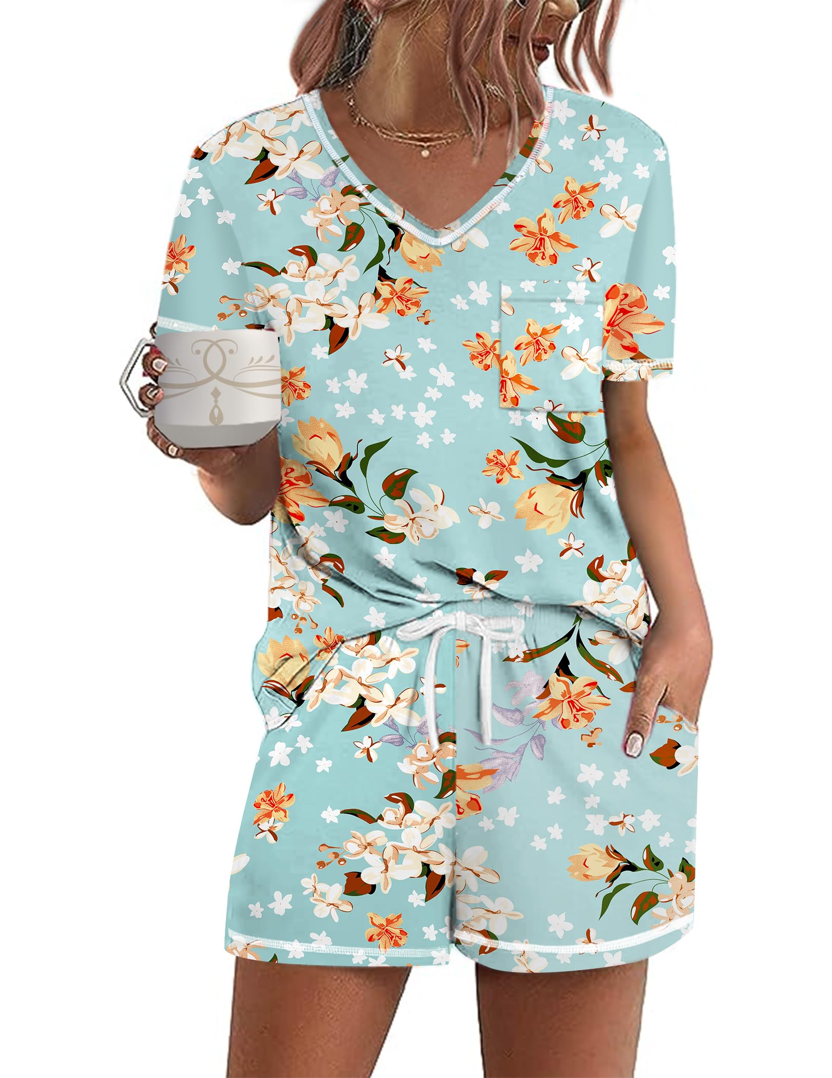 Design: The pajama top features classic chest pocket and V neck, with exquisite hemming workmanship; the pajama shorts features adjustable drawstring and pockets. Loose fit lounge sets, cute and comfy pajamas for women and teens girls