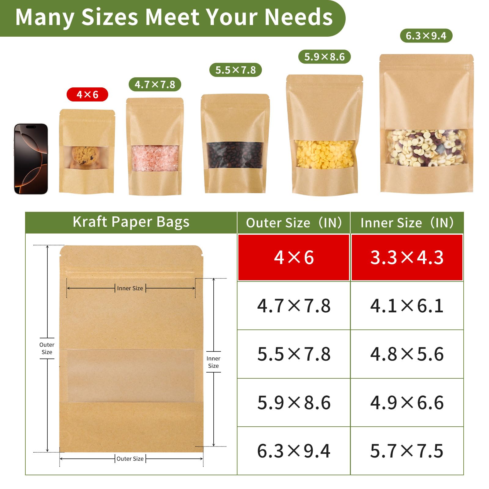[Quantity & Specification]50 pieces kraft bags included. Outer size:4x6, Inner size:3.3x4.3.Please make sure what you would like to pack before place a specific size order.(The inner size is the precise room for packaging)
