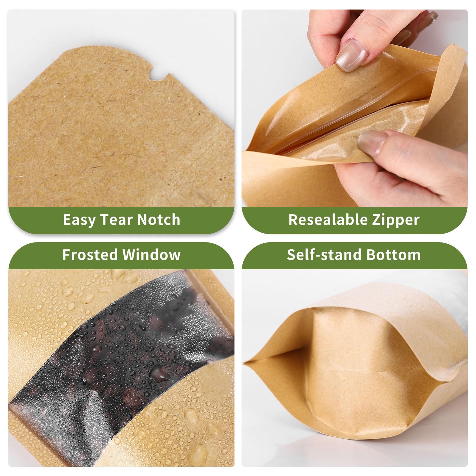 [Zipper Lock & Tear notch design]There are a zip lock and U-shaped notch on the top of our resealable pouches, which makes it easy to tear by adults and kids and helps customers reclose the bag and keep what is packed inside away from water and air.