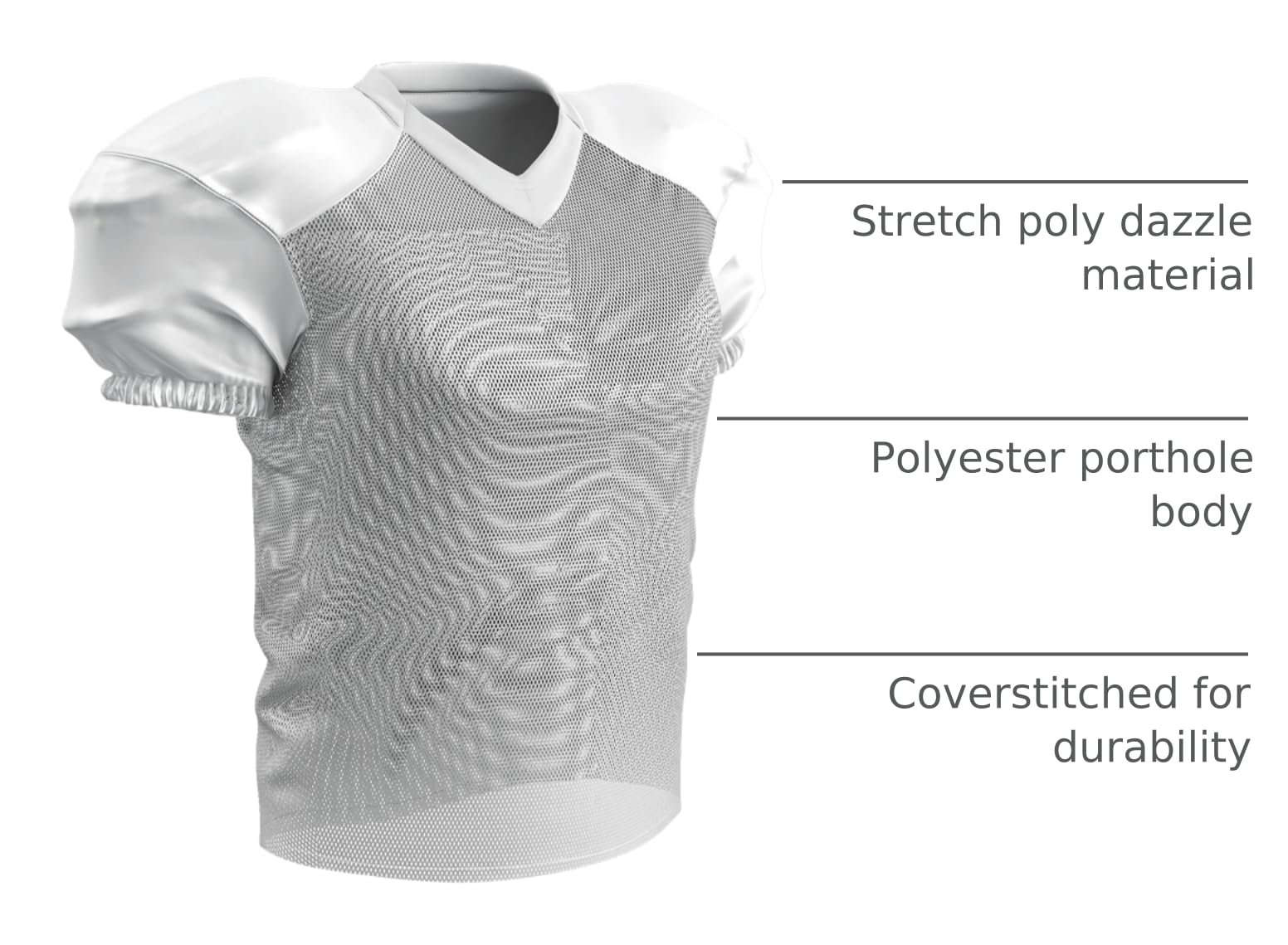 CHAMPRO Time Out Polyester Practice Football Jersey. STRETCH POLY DAZZLE double-ply cowl, sleeves and v-neck. STRETCH POLYESTER PORTHOLE body. Mitered v-neck collar with space for decoration. Finished elastic sleeve, double needle hemmed bottom. Coverstitched & bar tacked for optimum durability.