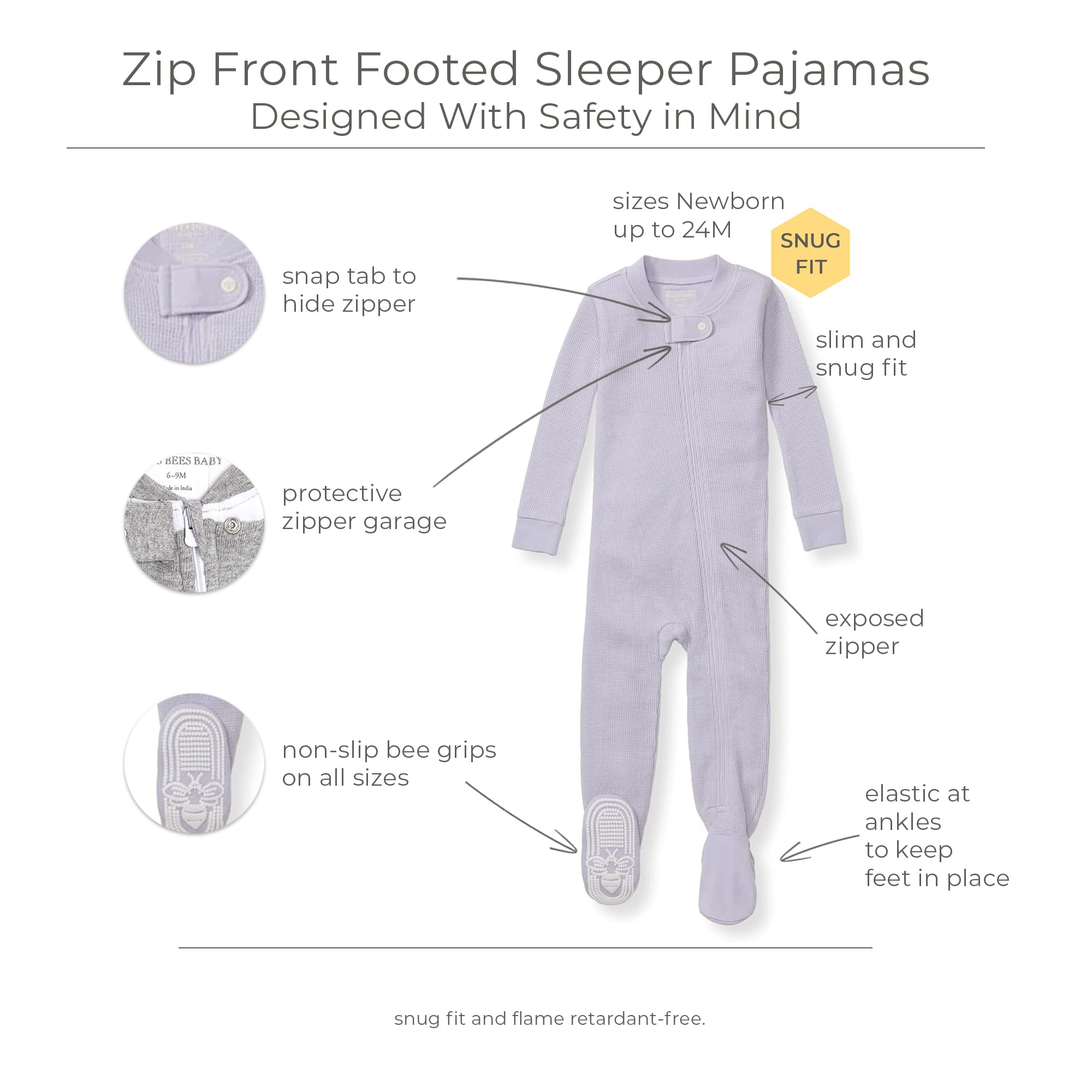 Bee Grips: Burt's Bees Baby footie PJs have a non-slip "bee grip" on the bottom of the foot to provide stability for early movers. This ensures your little bee stays steady during active playtime.