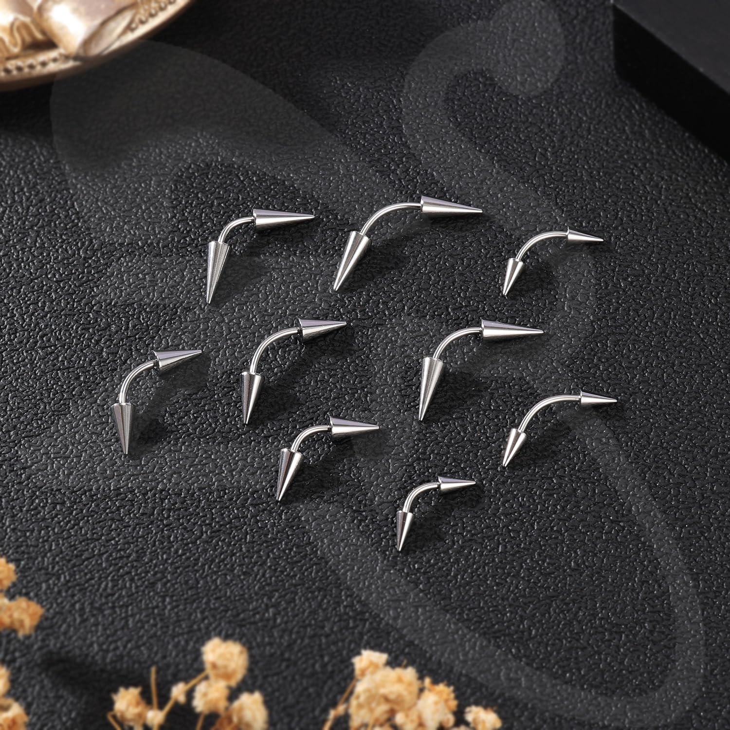 ❀Spike Eyebrow Piercing Size——Spike ecurved barbell piercing jewelry gauge: 16g(1.2mm); Rook jewelry bar length: 6/8/10mm. Lip jewelry Ball/ Cone Size: 3/6/8/10mm. Be careful the spike lip piercing long cone when using.