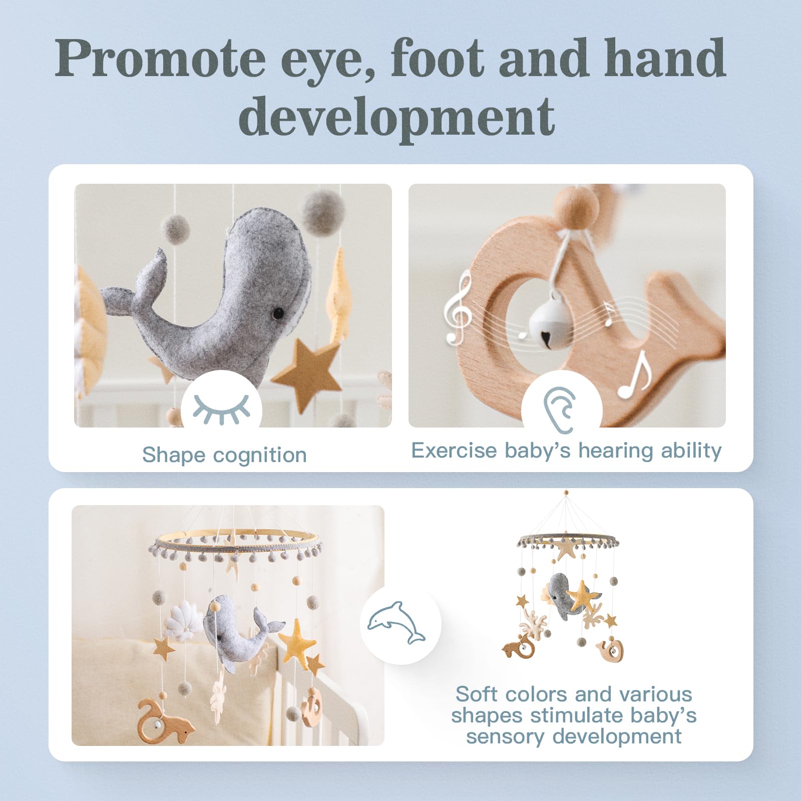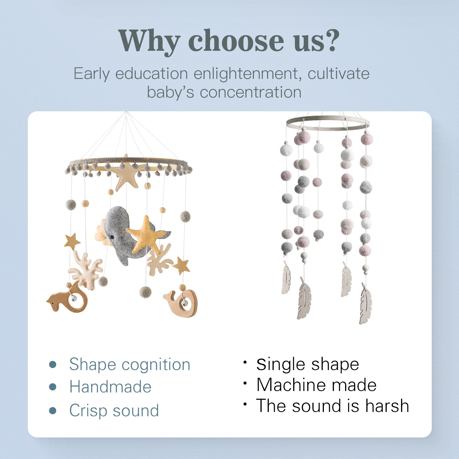 🐳SOOTHING AND CALMING - Our classic baby mobile featuring a bell, gently shaking the baby crib mobile will encourage your baby to focus and track, promoting sensory exploration and visual development. It also has a calming effect when baby is alone in the crib or waking up. The gentle sound will not disturb baby's peaceful dreams as they fall asleep, unlike noisy music boxes.