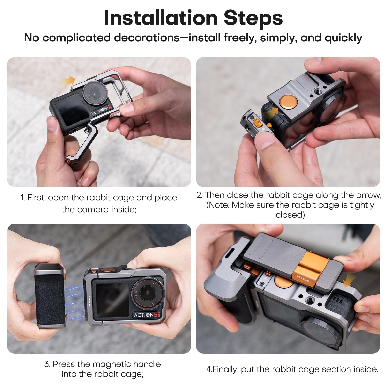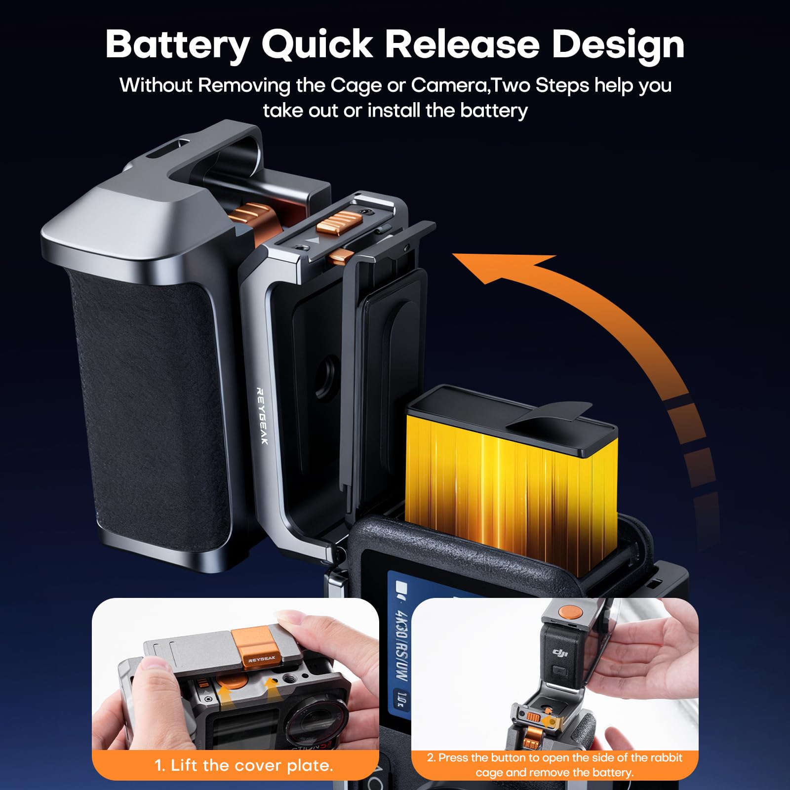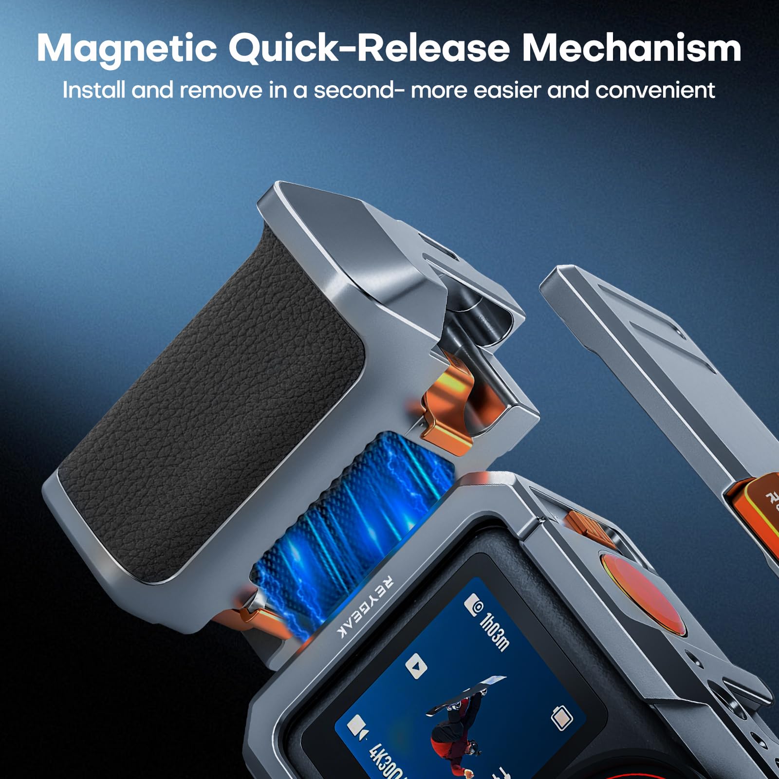 【Easy Battery Replacement without Disassembly】The REYGEAK action 4 aluminum street photography handle set features a magnetic quick release clip mount design, eliminating the need to remove the battery cage or disassemble the camera, making battery replacement effortless and convenient, allowing you to swap batteries between shots and capture fleeting moments.
