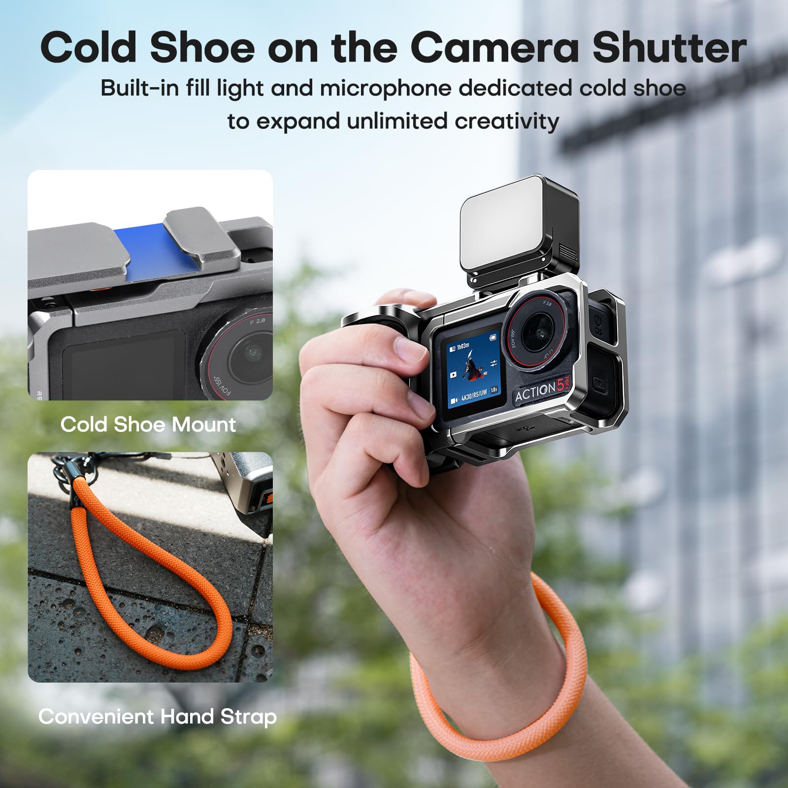 【Package includes】You will receive Ultra-Light Camera Cage × 1, Camera Handle × 1, Cold Shoe Button × 1, Wrist Strap × 1. (Note: This device is only compatible with DJI Osmo action 5 Pro/4/3, not other action camera).