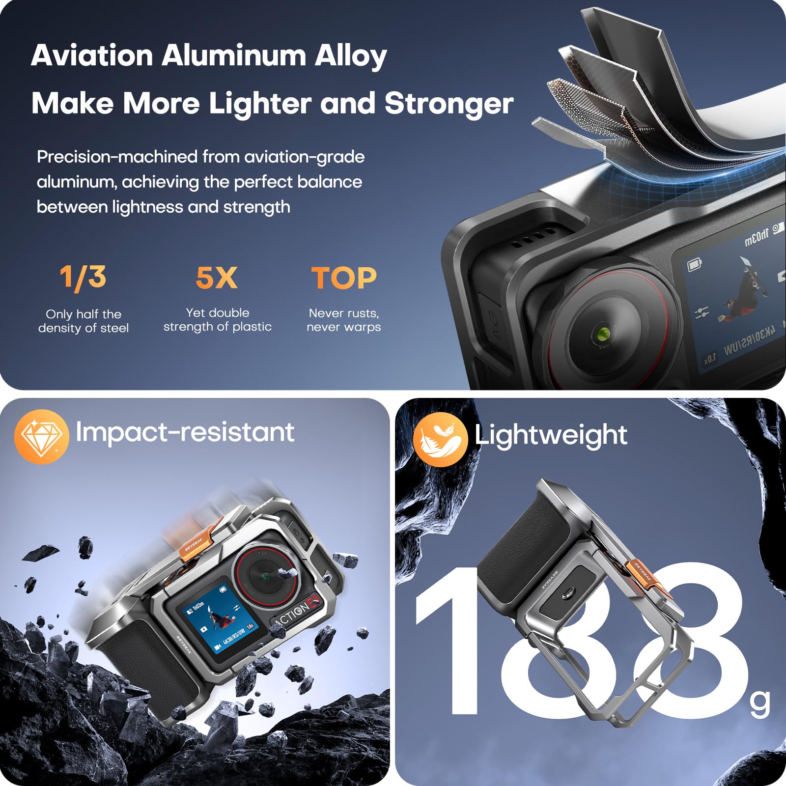 【Made of Aviation-Grade Aluminum】This custom Action 3 camera street handle is crafted from aircraft-grade aluminum using precision CNC technology for exceptional durability and resistance to impact, scratches, and abrasion, which also combines the lightweight and portability of a CCD camera, It is an ideal companion for street selfies, travel vlogs and everyday content creation.