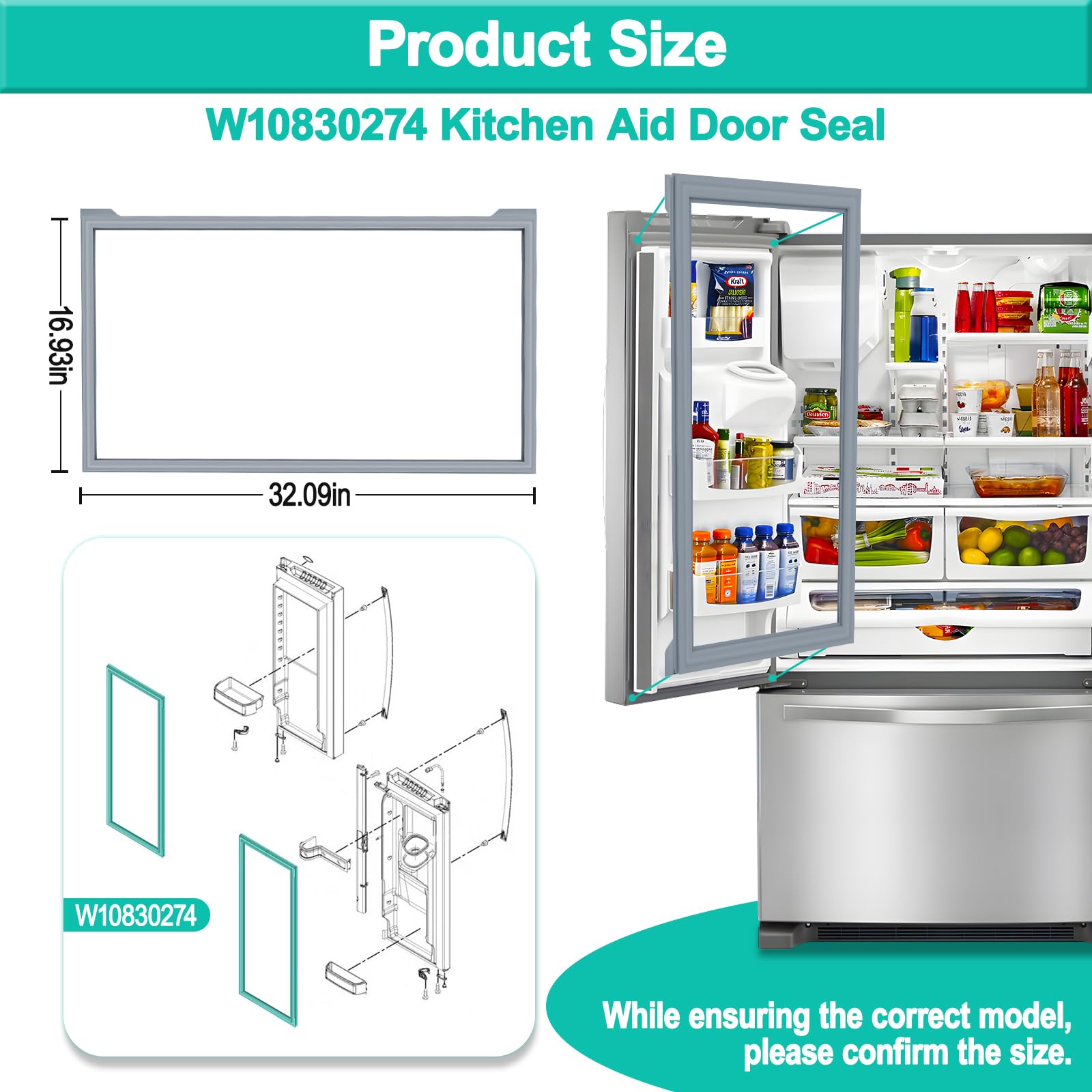 [Specification of W10830274 Fridge door seal] the W10830274 Whirlpool refrigerator seals dimension is 32.09" x 16.93" ,Color: gray. Measurement Method:Remove the refrigerator seal, measure the length and width between the outer diameter of the slots on the refrigerator door, and then measure the width of the slots to get the exact size of the seal.