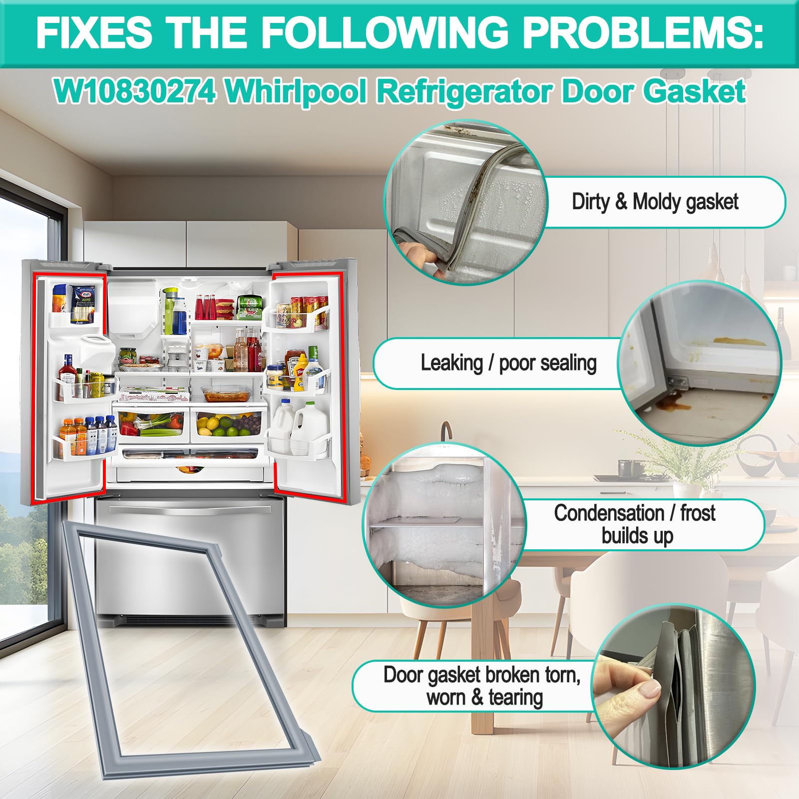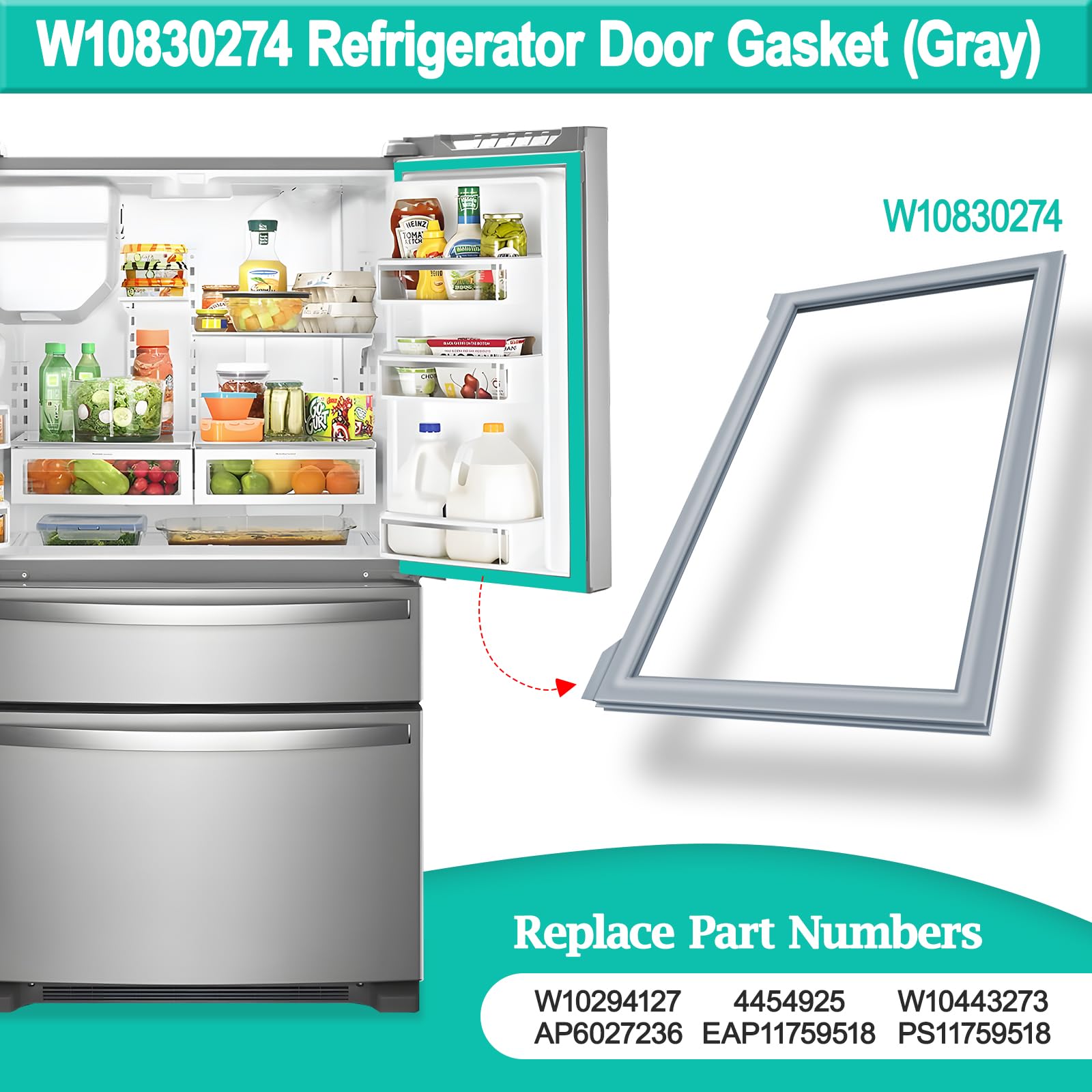 [Perfect Refrigerator Gasket Replacement Part] Durability upgraded W10830274 refrigerator gasket replacement can perfect solve following problems: ➊Door gasket broken torn, worn ➋Dirty gasket ➌Leaking / poor seal ➍Condensation builds up/ frost / ice build up inside. NOTE: Smooth folds and creases in gasket W10830274 by soaking it in warm water or warming it with a hair dryer on low heat.