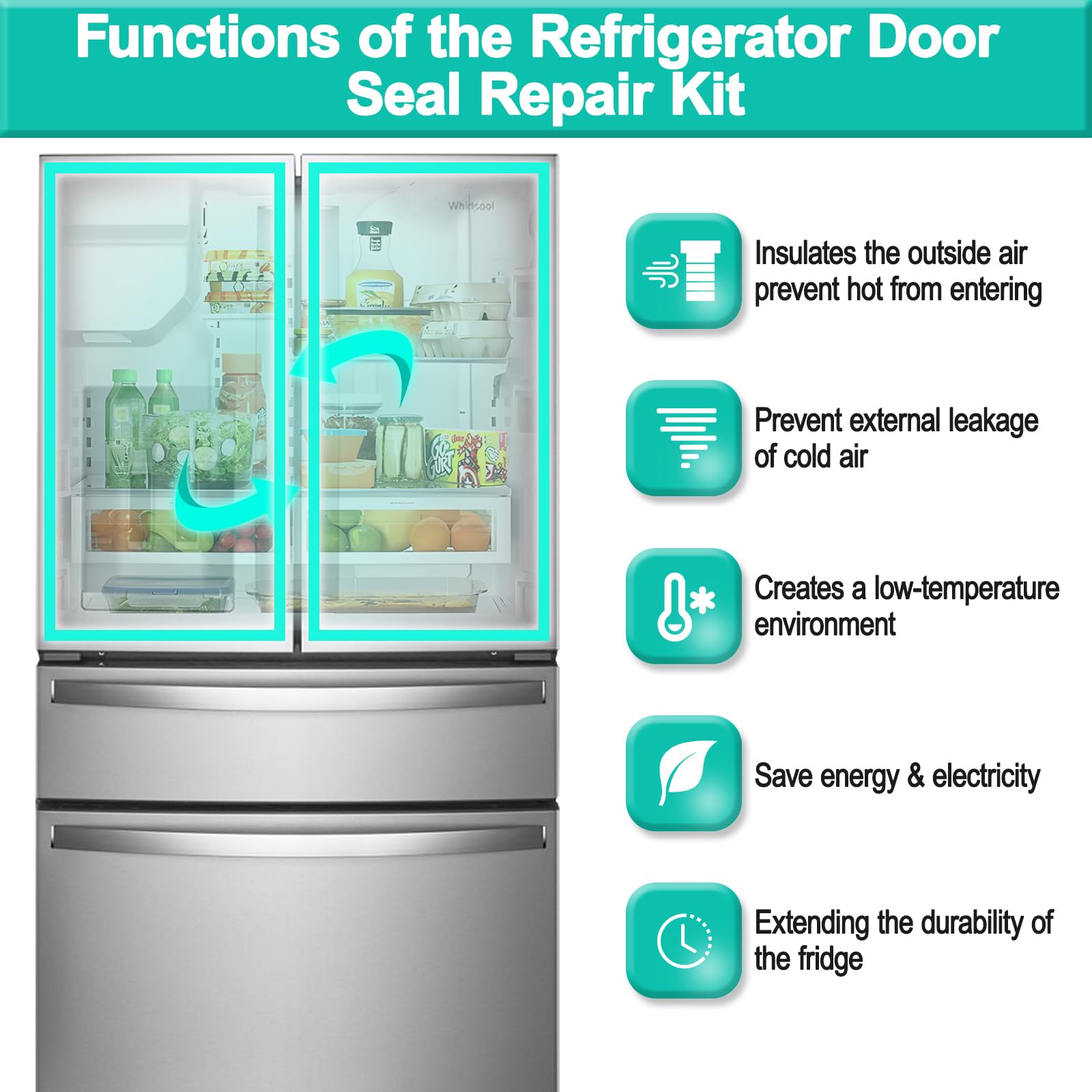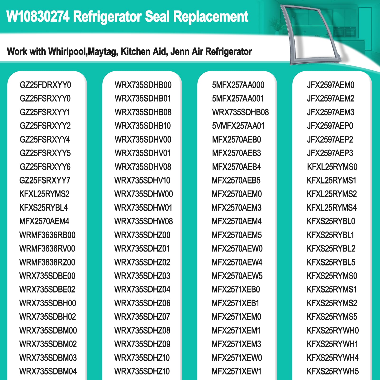 [Wide Compatibility] W10830274fridge door gasket compatible with Whirl-pool, Kitchen-Aid, May-tag, Jenn-Air,. Including JFX2597AEM2 JFX2597AEP2 KFXL25RYMS0 KFXS25RYBL1 KFXS25RYMS0 KFXS25RYMS2 KFXS25RYWH1 5MFX257AA001 MFX2570AEB0 MFX2570AEB5 MFX2570AEM5 MFX2570AEW4 MFX2571XEB1 MFX2571XEW0 WRX735SDBH00 WRX735SDBM04 WRX735SDBE02 WRX735SDHW00 WRX735SDHW01 WRX735SDHZ07 WRX735SDHZ06 WRX735SDHZ09 WRX735SDHZ10 WRX735SDHV10 WRMF3636RZ00 GZ25FDRXYY0 GZ25FSRXYY4 GZ25FSRXYY6 MFX2570AEM4 ...more compatibility, please check our product page. Before purchasing, check your device's model number to ensure compatibility.