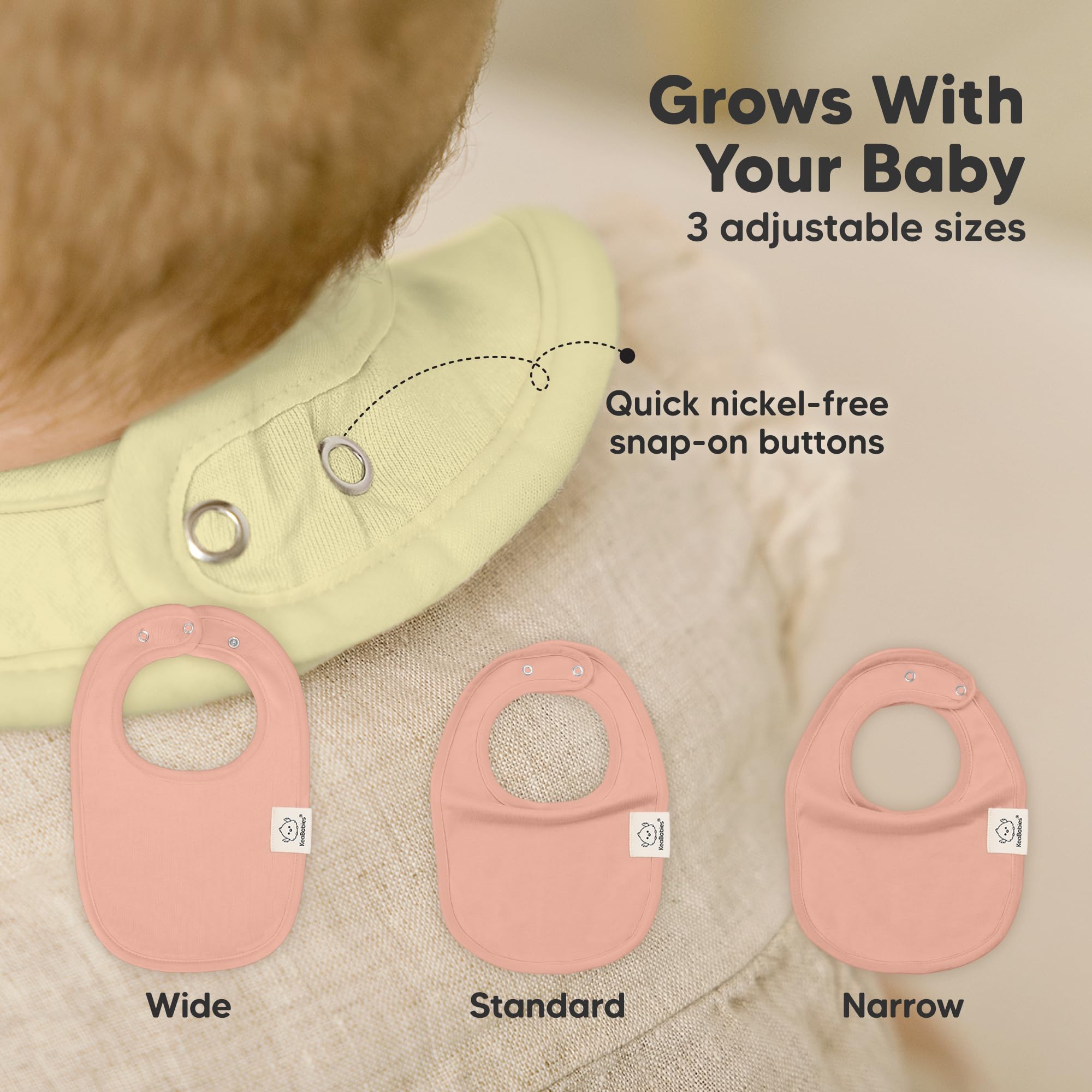 3 Adjustable Size With Soft Seams - With 2 sets of easily fasten nickel free snaps, you can adjust the girl and boy bibs according to your baby’s neckline. The soft wrapped organic cotton seams provide extra comfort for your baby and they won’t feel a thing while having the baby cotton bibs on. Suitable for newborn babies up to 24 months.