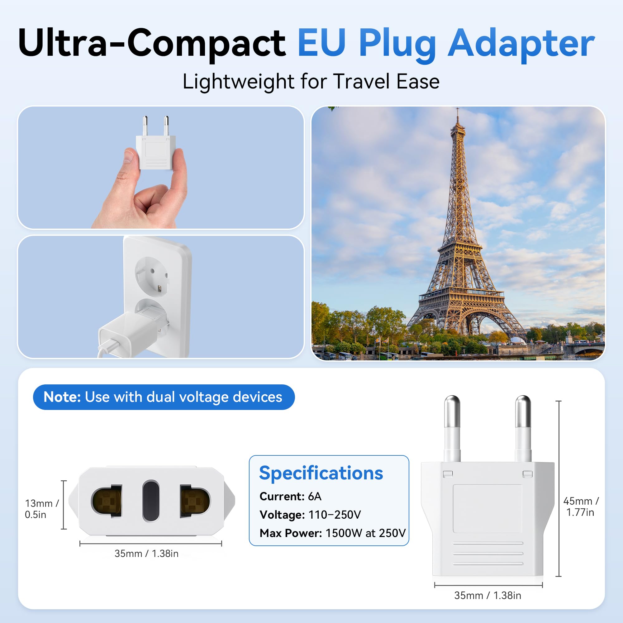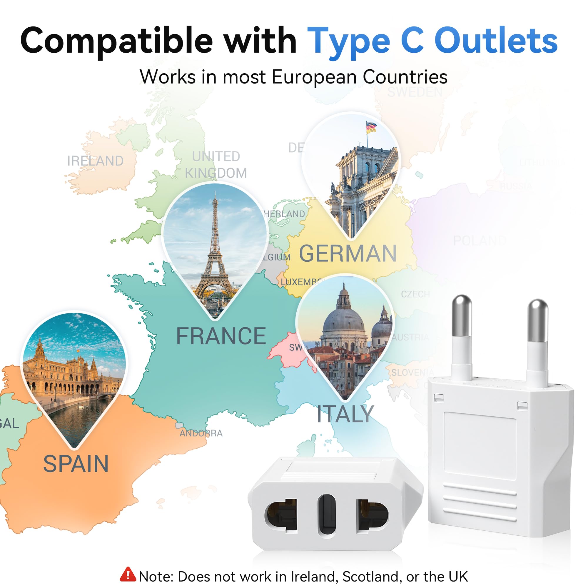 Compatible with all European outlets - Designed to fit all type C Europe sockets, including modern hexagonal wall outlets. Works in popular destinations like France, Germany, Italy, Spain, Greece, Portugal, Netherlands, Austria, Sweden, Turkey, and many more. (Not compatible with UK or Ireland type G outlets.)