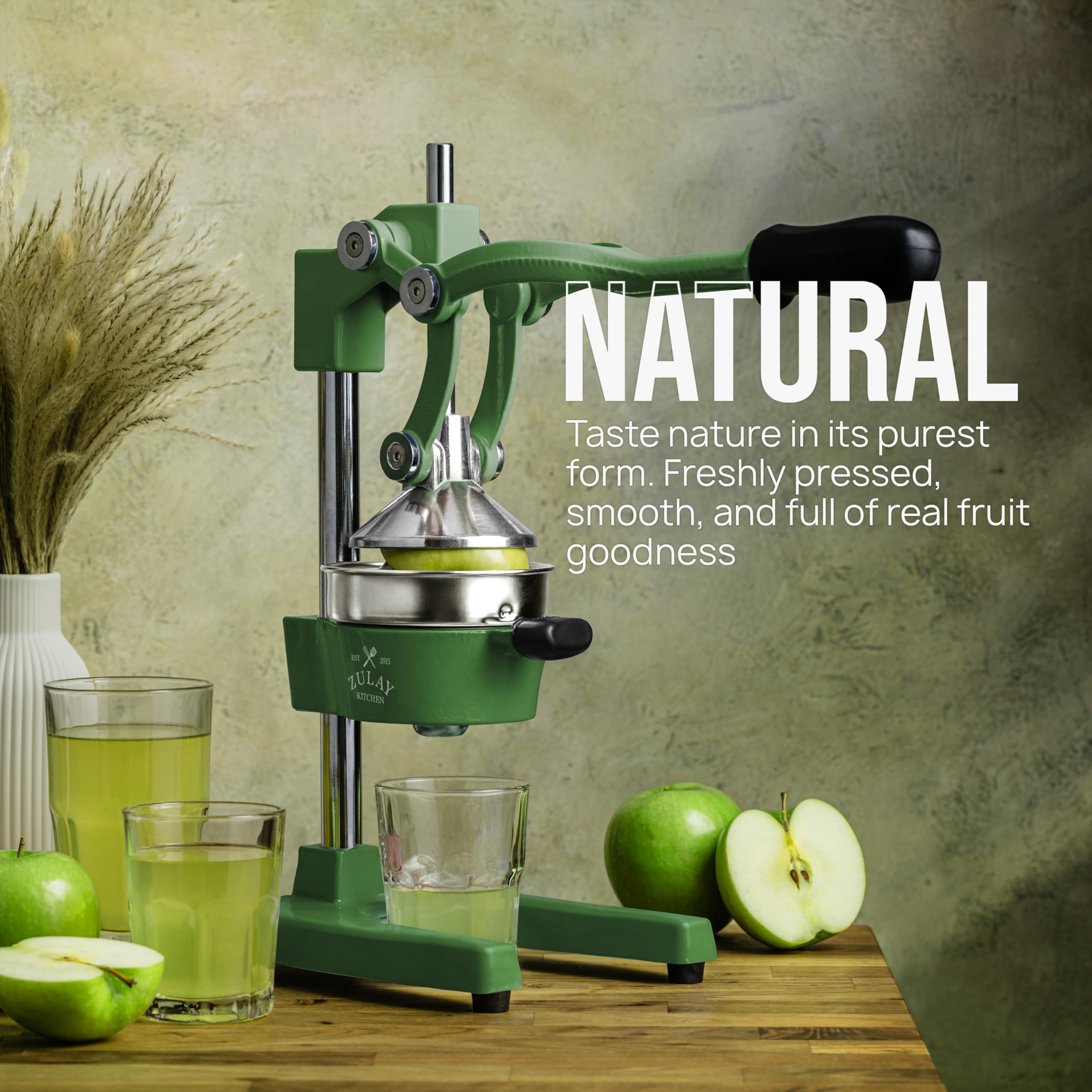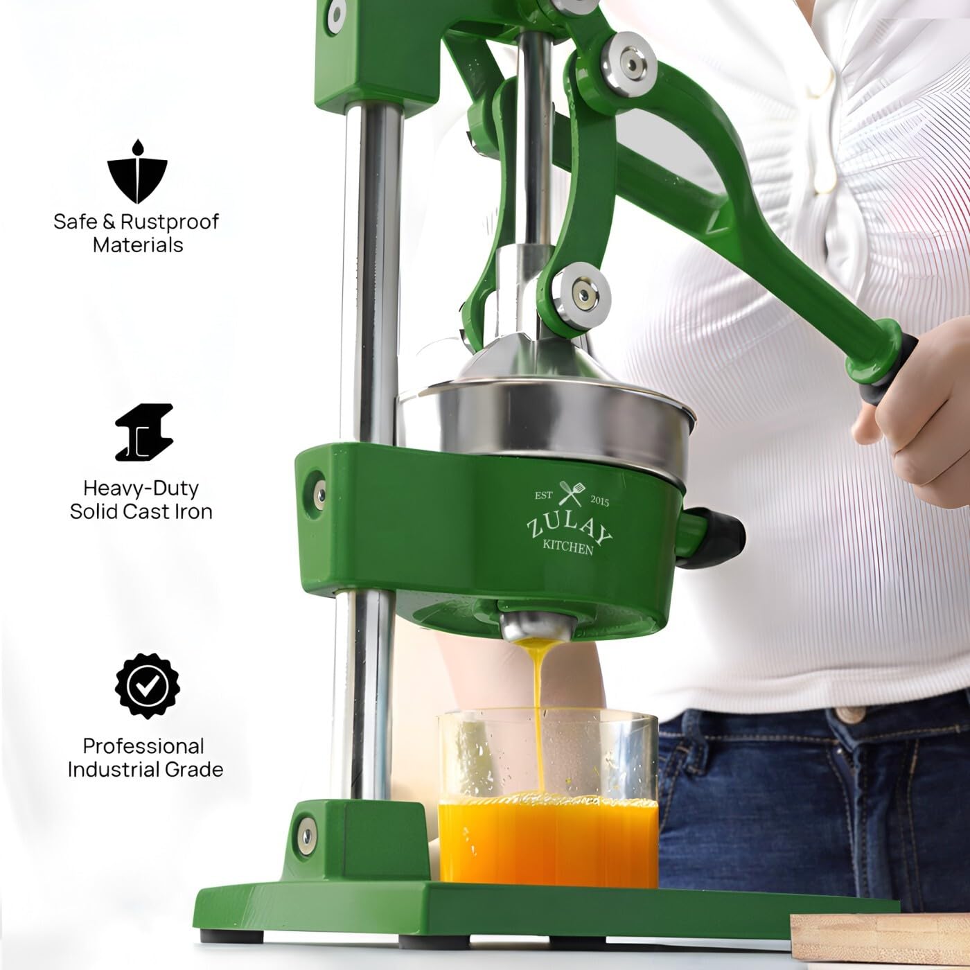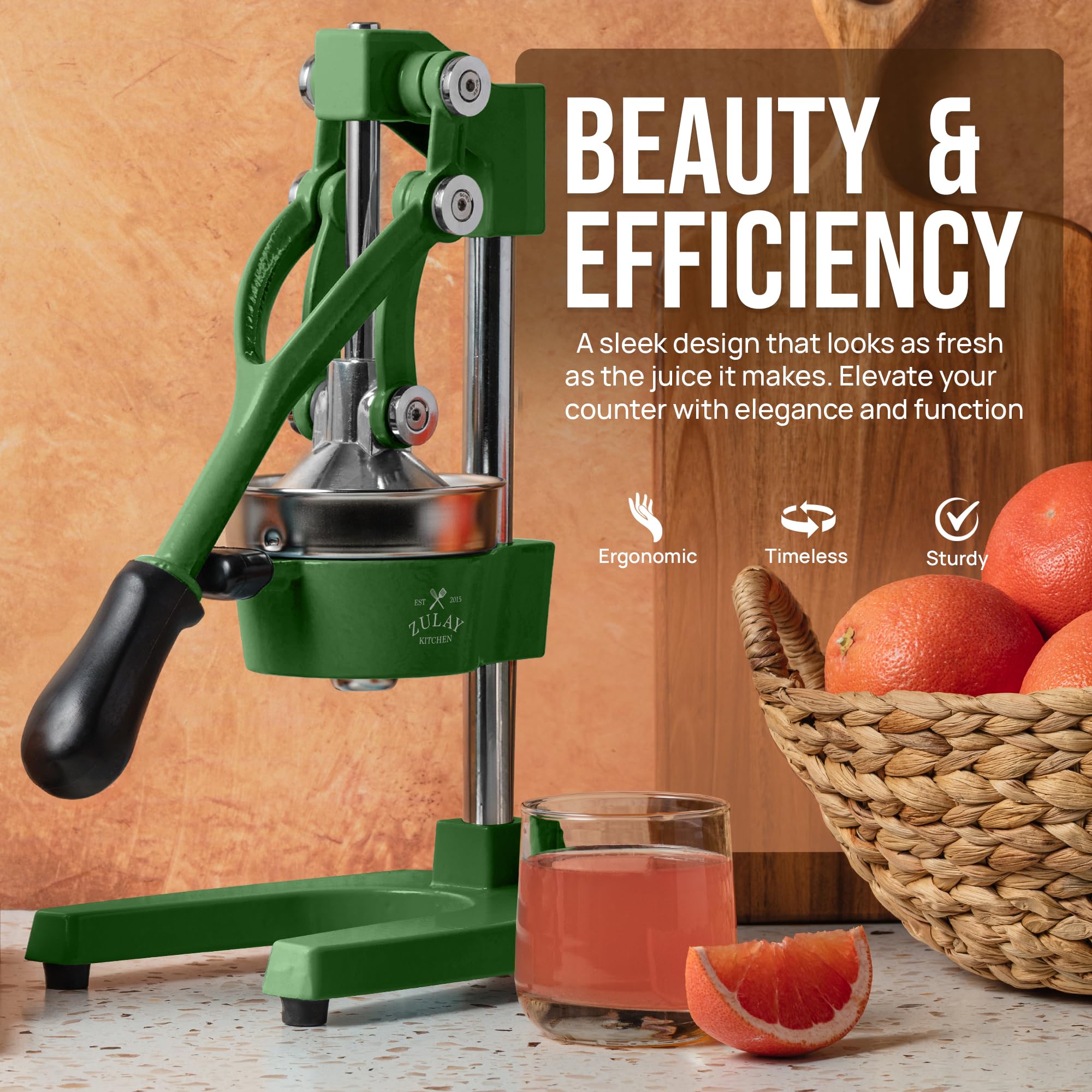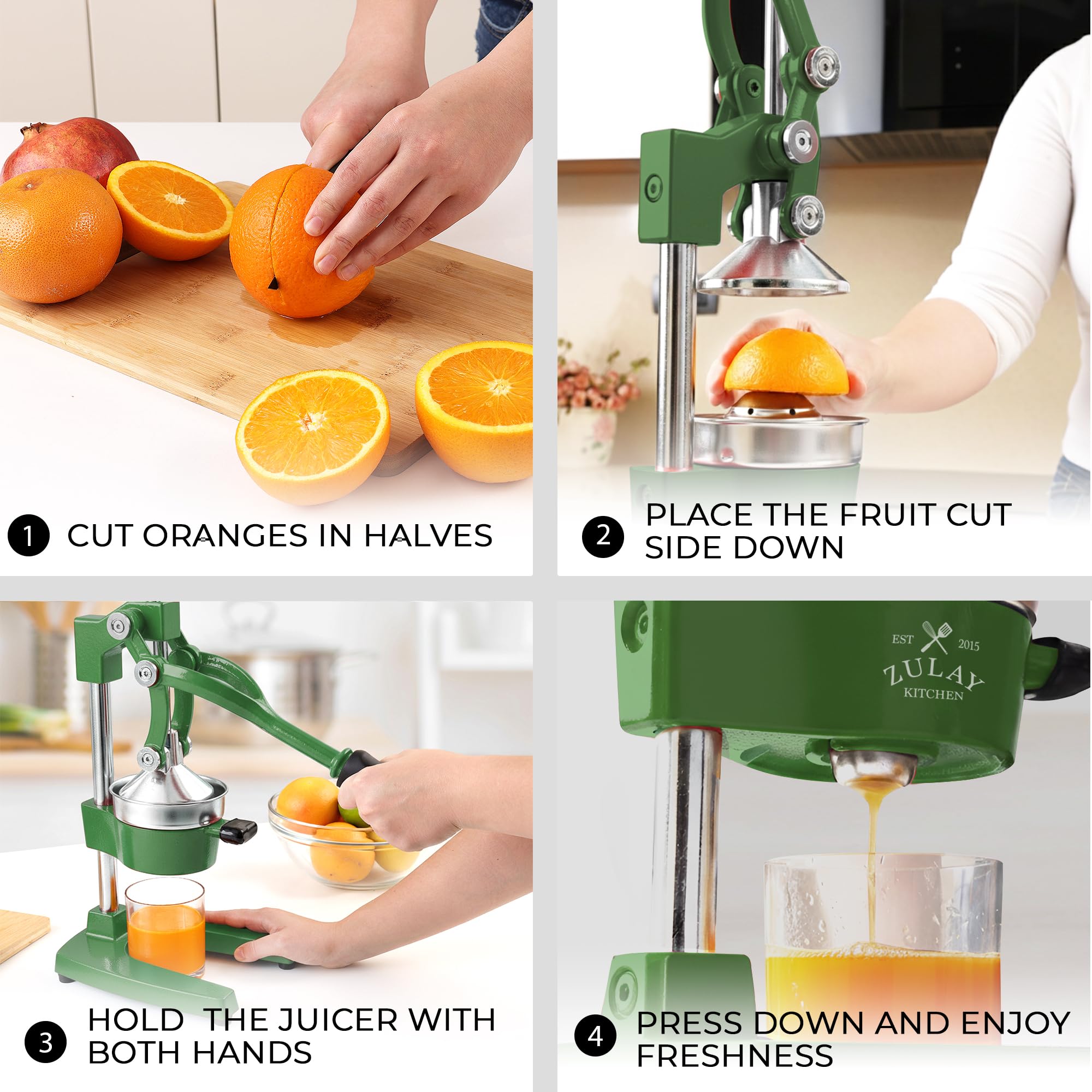 About this item SQUEEZE OUT EVERY DROP OF JUICE:Our lemon squeezer won’t waste even a single drop from your favorite fruit and will also leave the seeds and pulp behind! The 5-inch diameter of the citrus press bowl makes it suitable for various types and sizes of fruit. Watch the juicy goodness of limes, lemons, oranges, grapefruit, apples, pineapples, pomegranates, and other citrus fruits come straight out of the citrus squeezer, ready to add flavor to your meals or drinks. SAVE TIME AND EFFORT:Our citrus juicer makes juicing easy-peasy lemon squeezy. The comfortable grip handle allows you to squeeze all the juice from lemons, limes, or oranges in seconds for making delicious recipes like guacamole, lemonade, cocktails, and more. Unlike bulky electric juicers, you no longer have to worry about electricity or replacing batteries with this manual citrus press. STURDY AND DURABLE MATERIAL:This manual juicer is made of heavy-duty cast iron that can easily withstand the pressure from continuous pressing for years to come. The leverage mechanism allows a one-time easy pull to get all the juice out. Our citrus press is designed with a heavy rubberized base to firmly keep it in place without the fear of falling, tipping, or sliding off the counter. This hand juicer is great for both professional and at-home use. EASY TO CLEAN AND SAFE TO USE:Focus more on extracting fresh fruit juice than worrying about cleaning up. All parts of this juice press are detachable and dishwasher friendly, which makes cleaning super quick. The stainless steel bowl and filter cone are made using material, making the fruit squeezer safe and healthy to use. HASSLE-FREE, ZULAY GUARANTEE:We love and take our pomegranate juicer and back it up with a lifetime guarantee. Have the confidence that this product will last. If there are ever any issues, just contact us and we will make it right.