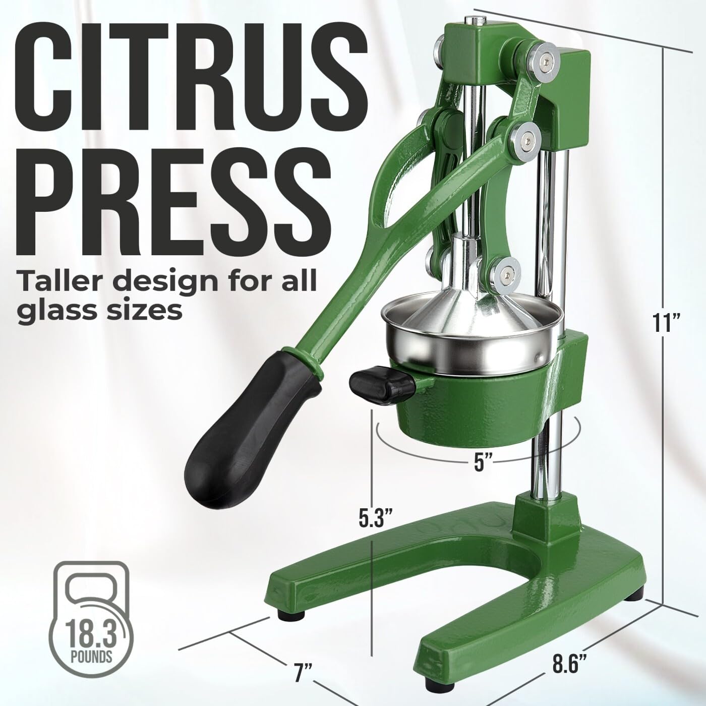 STURDY AND DURABLE MATERIAL: This manual juicer is made of heavy-duty cast iron that can easily withstand the pressure from continuous pressing for years to come. The leverage mechanism allows a one-time easy pull to get all the juice out. Our citrus press is designed with a heavy rubberized base to firmly keep it in place without the fear of falling tipping or sliding off the counter. This hand juicer is great for both professional and at-home use