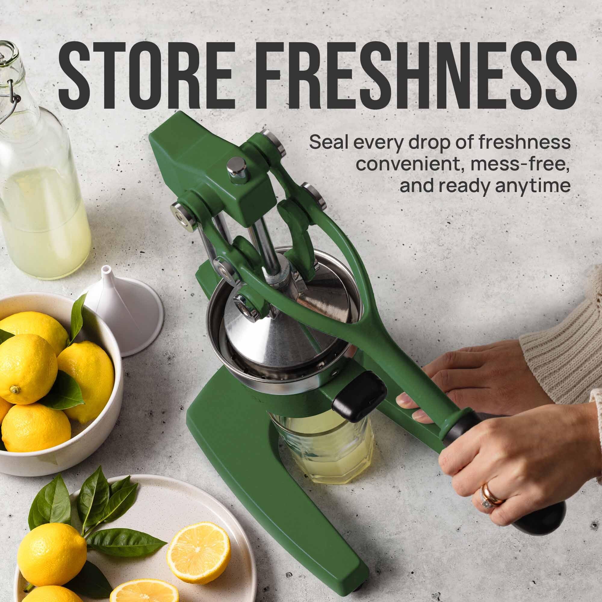 SAVE TIME AND EFFORT: Our citrus juicer makes juicing easy-peasy lemon squeezy. The comfortable grip handle allows you to squeeze all the juice from lemons limes or oranges in seconds for making delicious recipes like guacamole lemonade cocktails and more. Unlike bulky electric juicers you no longer have to worry about electricity or replacing batteries with this manual citrus press