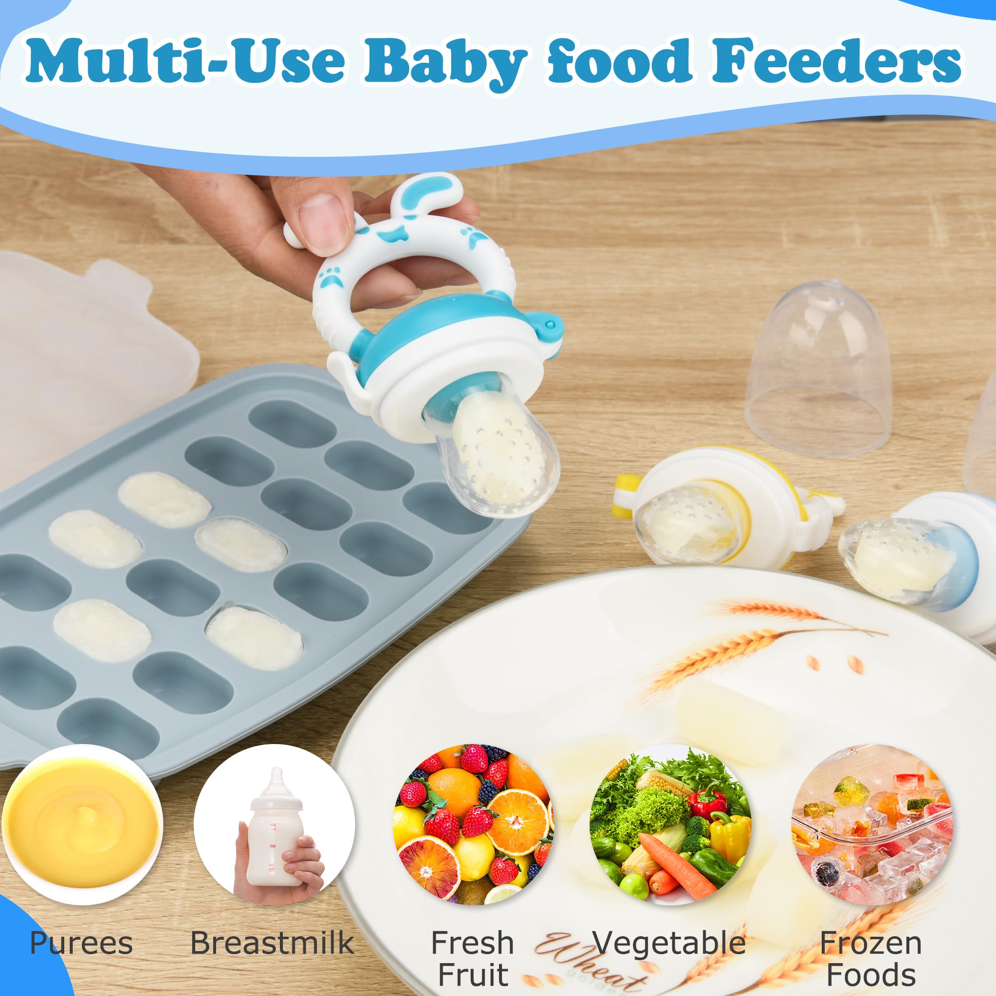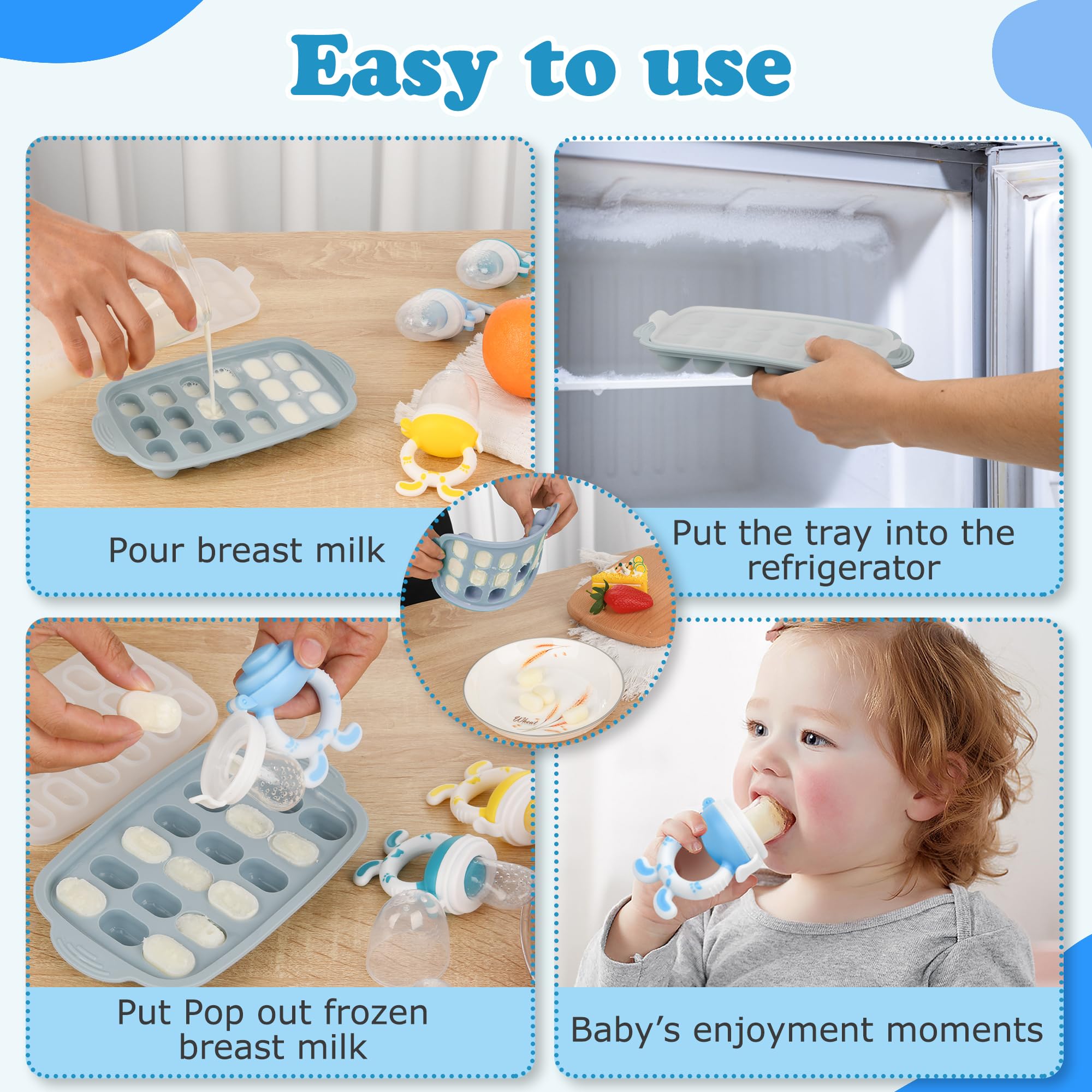 【BREASTMILK POPSICLE MOLD FOR BABY】-with this silicone Baby Food freezer tray you can get perfect sized frozen portions for baby fruit food feeder pacifier, you can put breastmilk, purees, juices or some baby food to freeze, and put the frozen pieces into baby feeder, easy to get a frozen milk popsicle, allows babies to enjoy the fun of chewing.breast milk popsicle teether is pefect for babies with sore gums also.