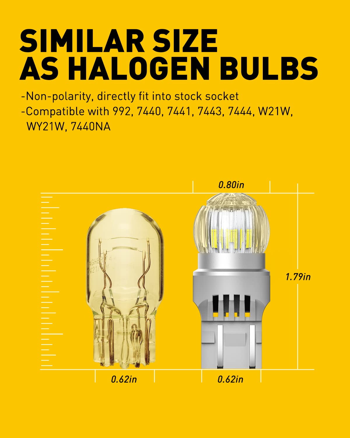 【Directly Fit & Multi Application】Non-polarity, plug and play! Canbus design, no error and no flickering for backup light/reverse light for 99% of vehicles. Compatible with socket 992, 7440, 7441, 7443, 7444, W21W, WY21W, 7440NA, 7440NAK, 7444NA, 7444NAK, 7443LL, T20, etc