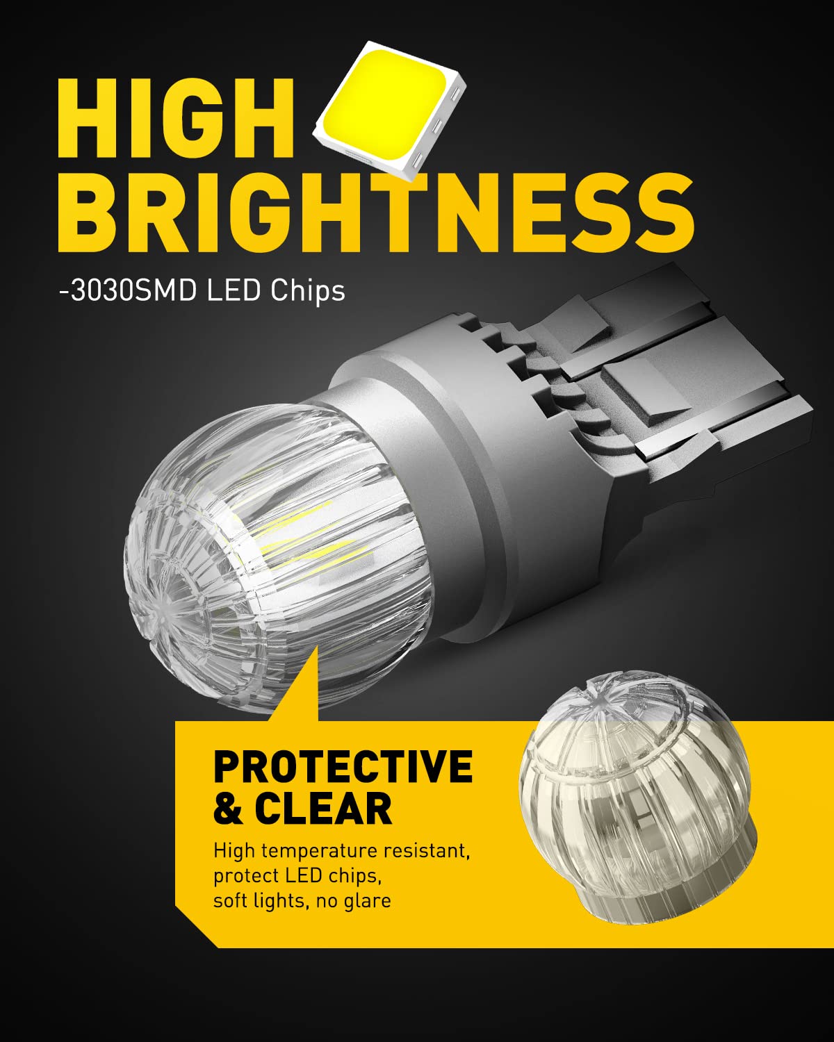 【Ultra Bright & Safer Upgrade】 AUXITO white 7440 led bulbs utilize newest powerful and high quality 3030SMD led chips. Generating 4 times brighter output and larger lighting area than halogen, see more clearly when reversing. Keep safe