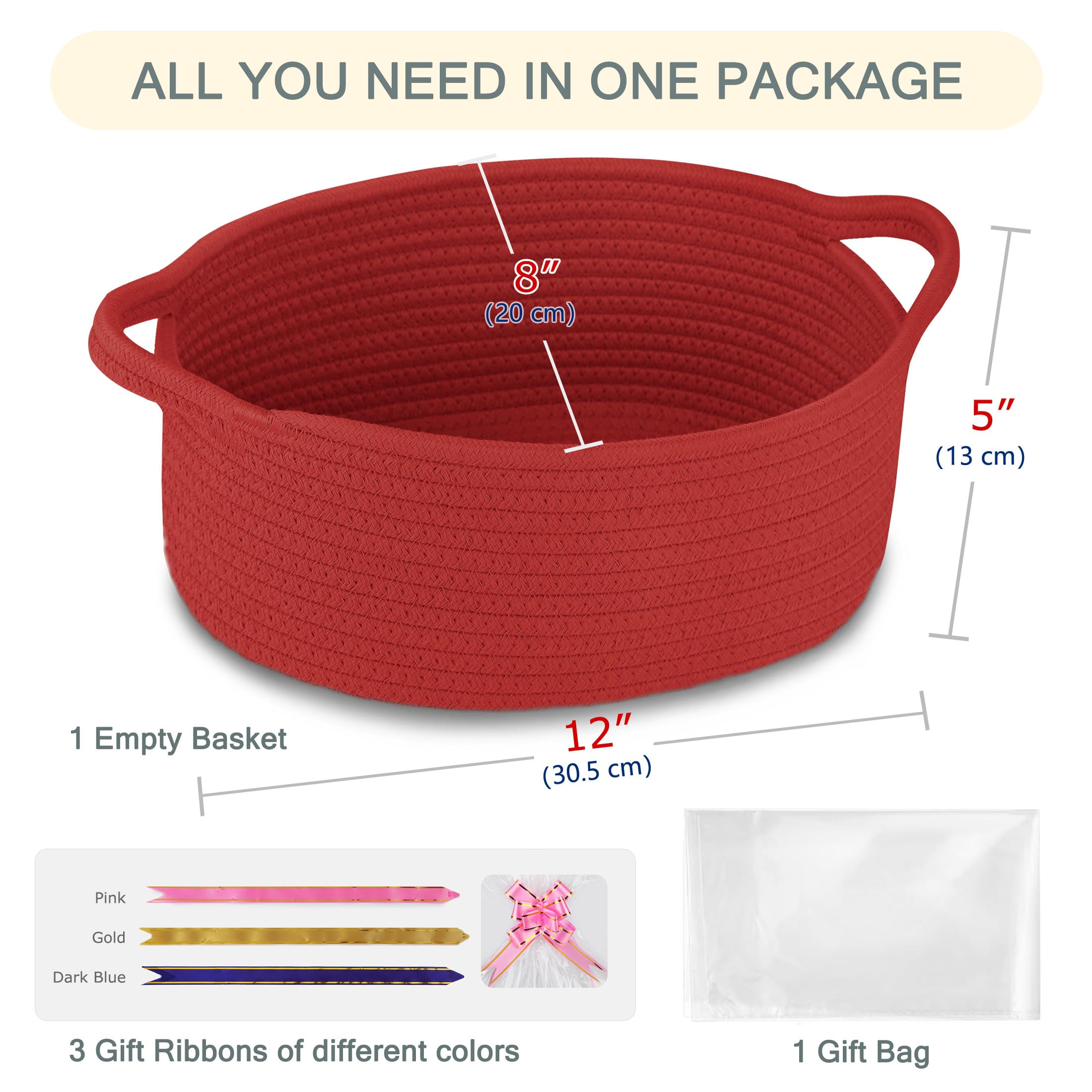 【Ideal Size and Material】The cute small empty gift basket size is 12“ x 8” x 5”. The soft basket is made of natural cotton rope, a healthy, chemical-free material that is safe for kids and pets.Our gift baskets are available in a variety of colors.The classic solid color design enhances any room or decor in your home.