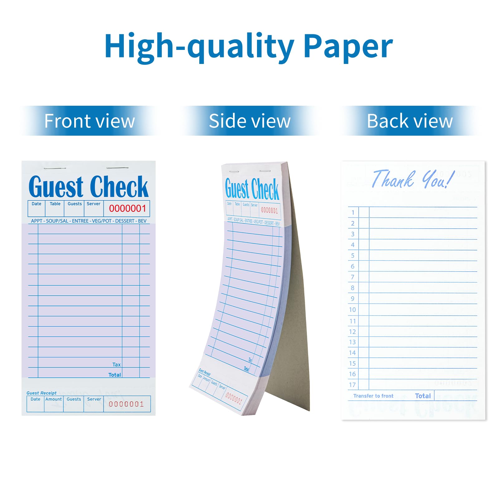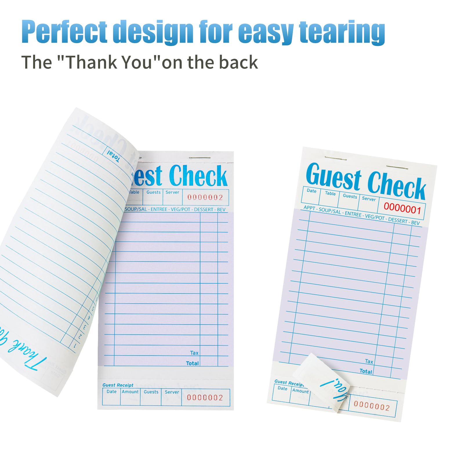 Convenient Work: These guest check books for servers have a tear-free dotted line that is easy to rip off. You can give as a customer copy or keep for record keeping. We've provided extra rows on the back for additional note taking.Perfect For Restaurants, Lounges, Hotels, Cafes, And Waiters To Use.