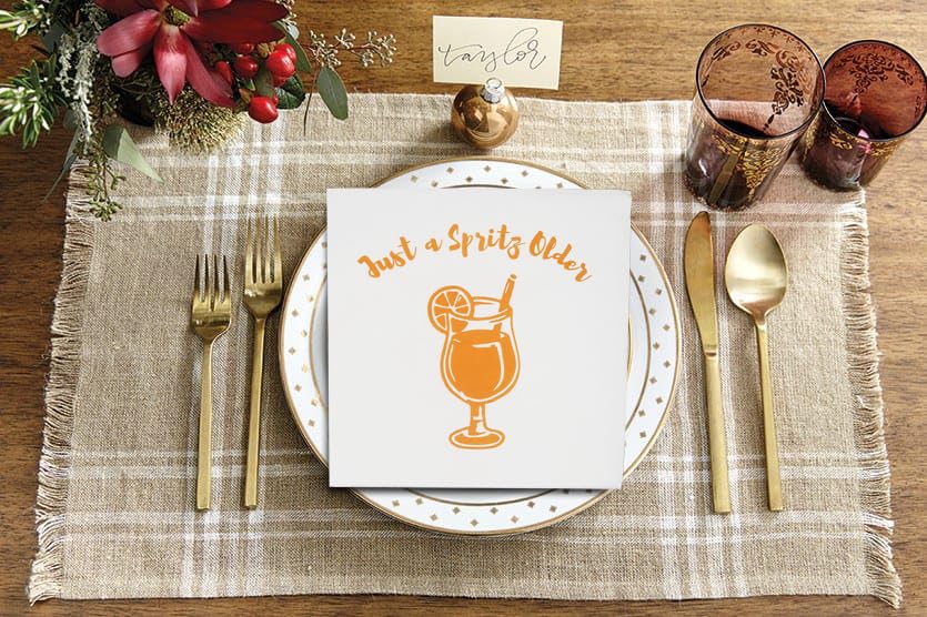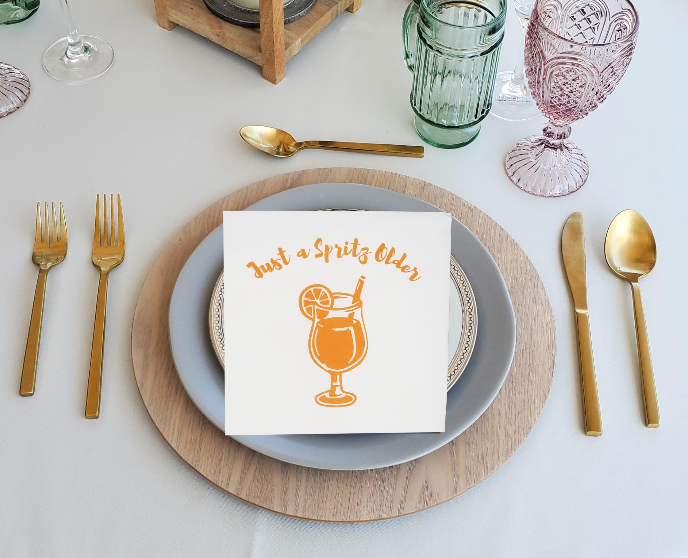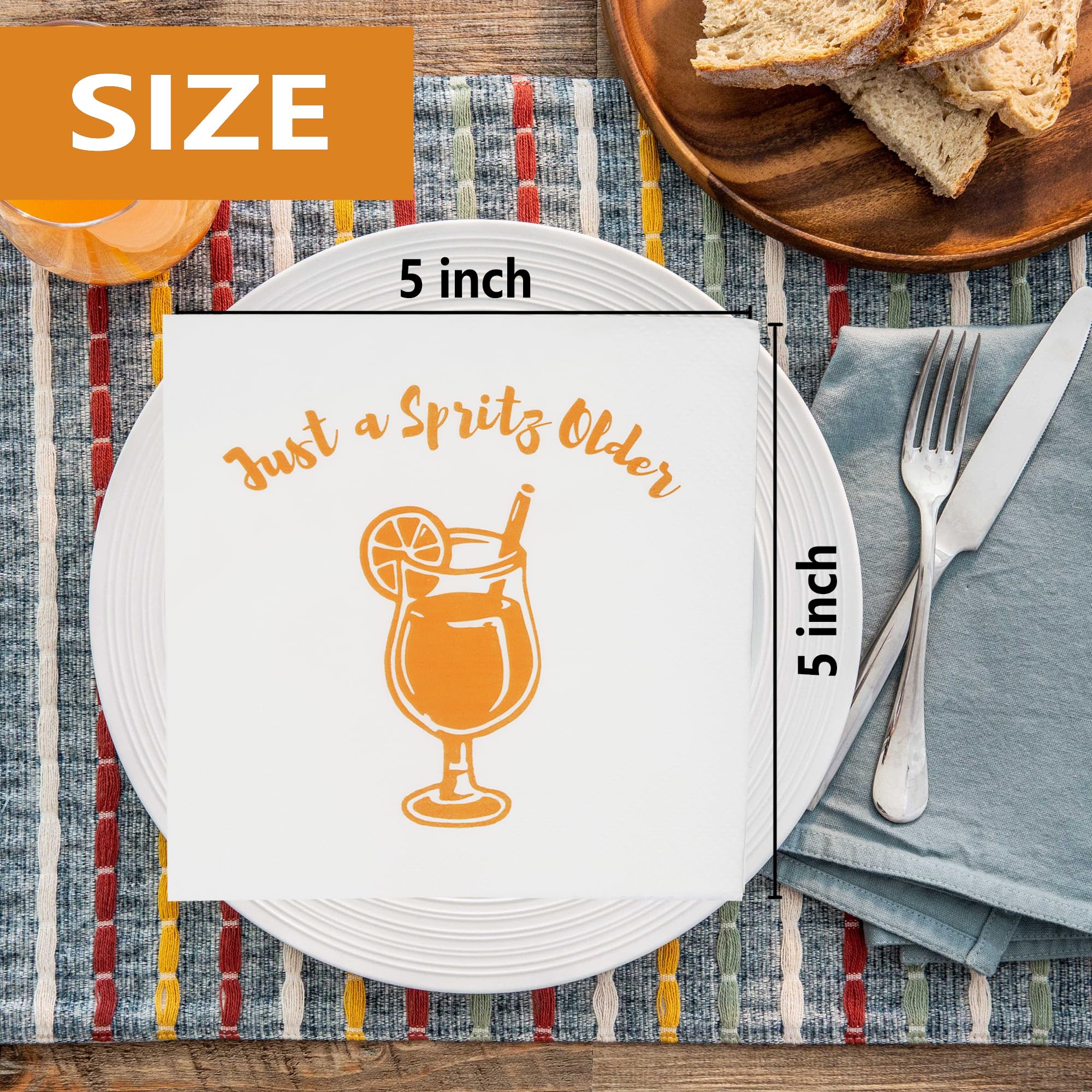 Protect Your Surfaces: Our napkins read”Just a spritz older ”. It will elevate the party and keep your tables clean and stain-free from spilled food, milk, juice