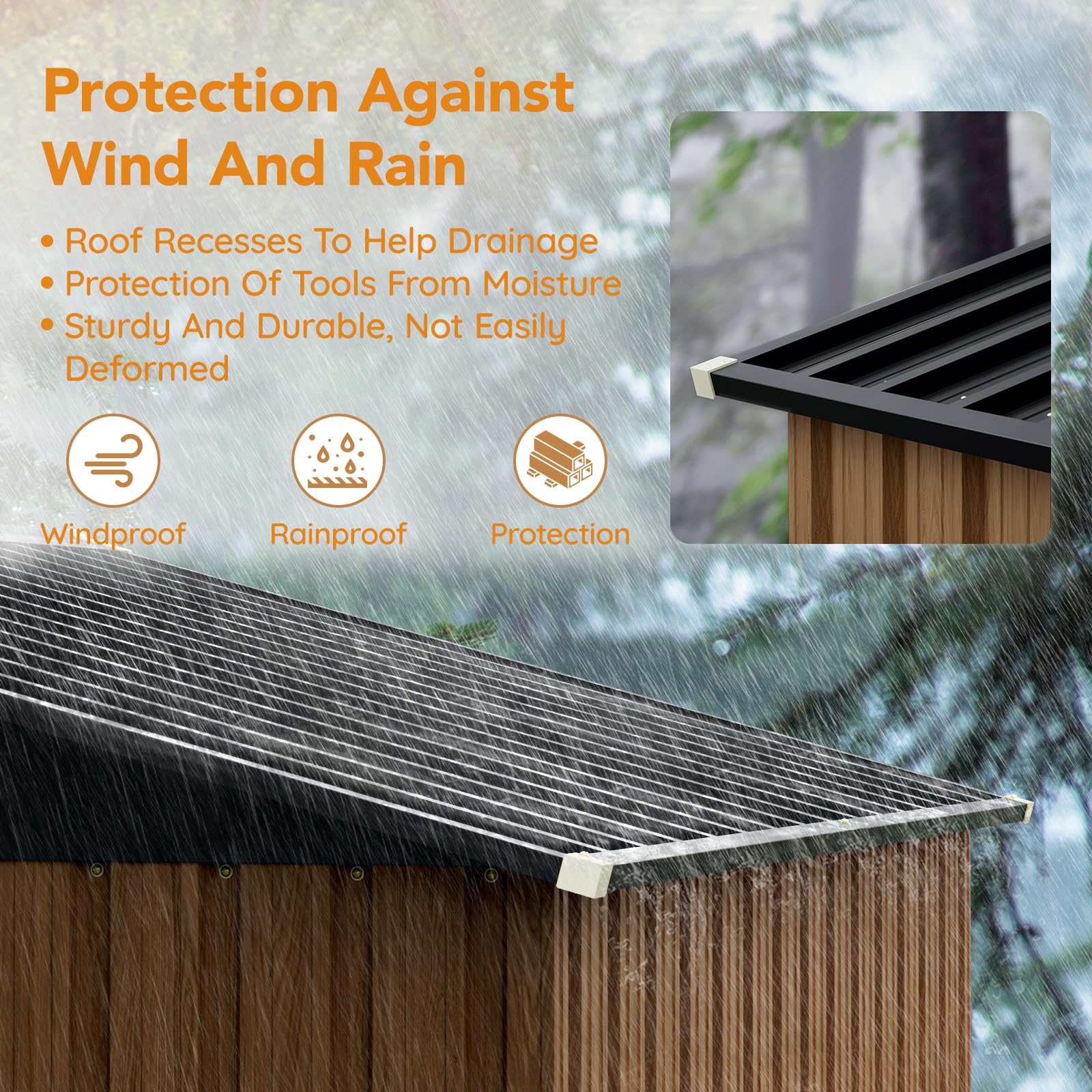 [Security and Durability] The whole storage shed is a steel frame structure, the metal garden storage shed adopts electro-galvanized steel process and paint treatment, which is suitable for various climates, without worrying about the metal rusting, the all-metal storage shed will not be deformed by the sun, and has excellent moisture-proof ,UV resistant performance.
