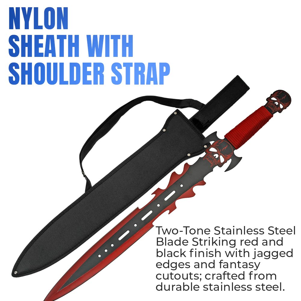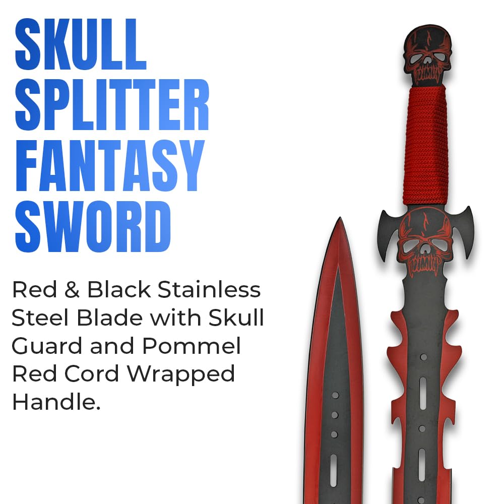 Unleash dark fantasy vibes with the 27" Skull Splitter Fantasy Sword by Szco Supplies—a blade forged for collectors, cosplayers, and enthusiasts of apocalyptic or horror-themed gear. With a total length of 27 inches, this fearsome sword features a jagged, two-tone stainless steel blade in blood-red and black, complete with edgy cutouts that scream post-apocalyptic menace. The standout details include a bold red skull on both the guard and pommel, adding to its brutal undead warrior aesthetic. The metal handle is wrapped in red cord for secure handling and visual impact, while the included black nylon sheath with shoulder strap makes it easy to carry or display. Whether you're a collector of unique fantasy weapons, prepping your next cosplay, or decorating your game room or man cave, this Skull Splitter is a must-have piece that commands attention.