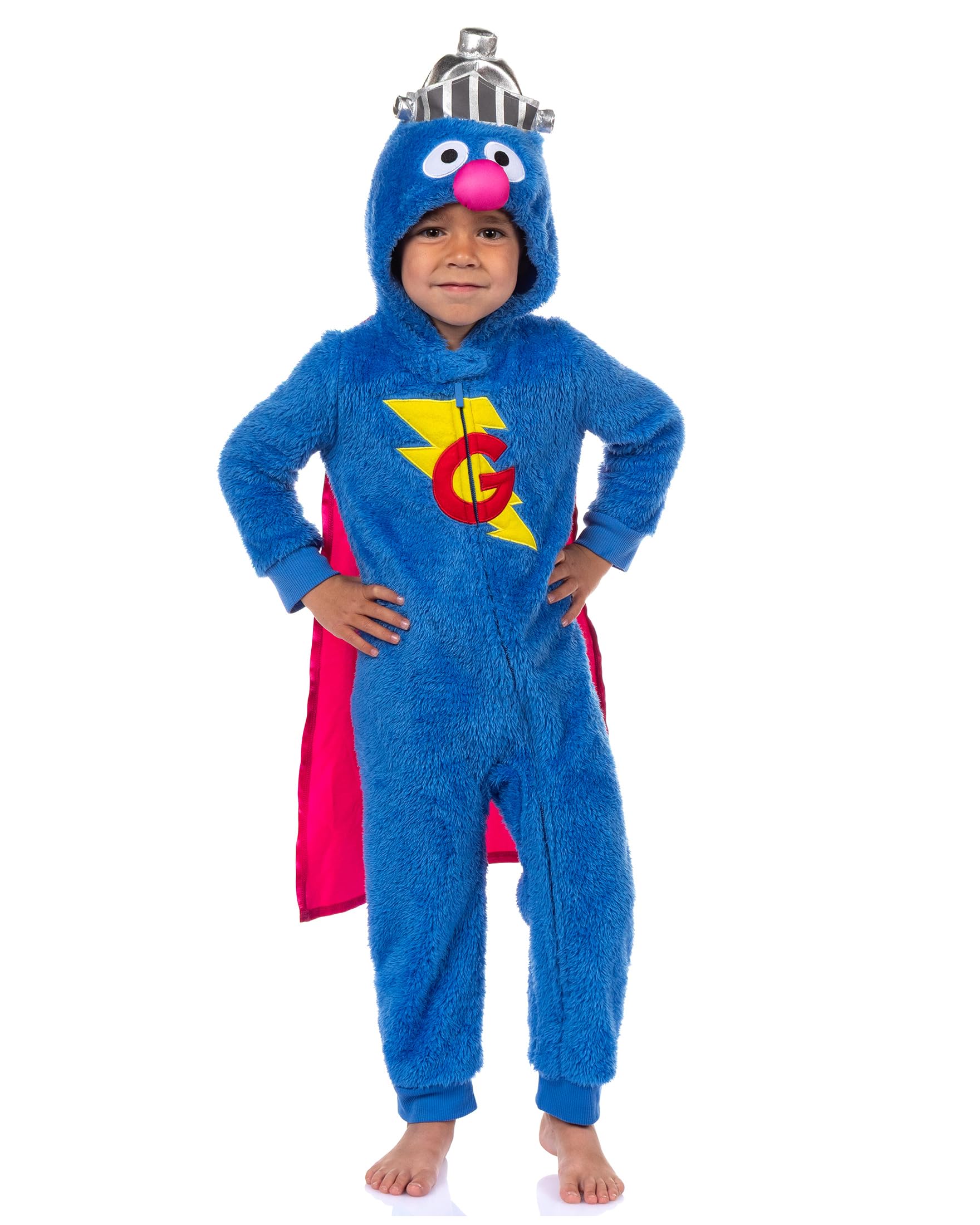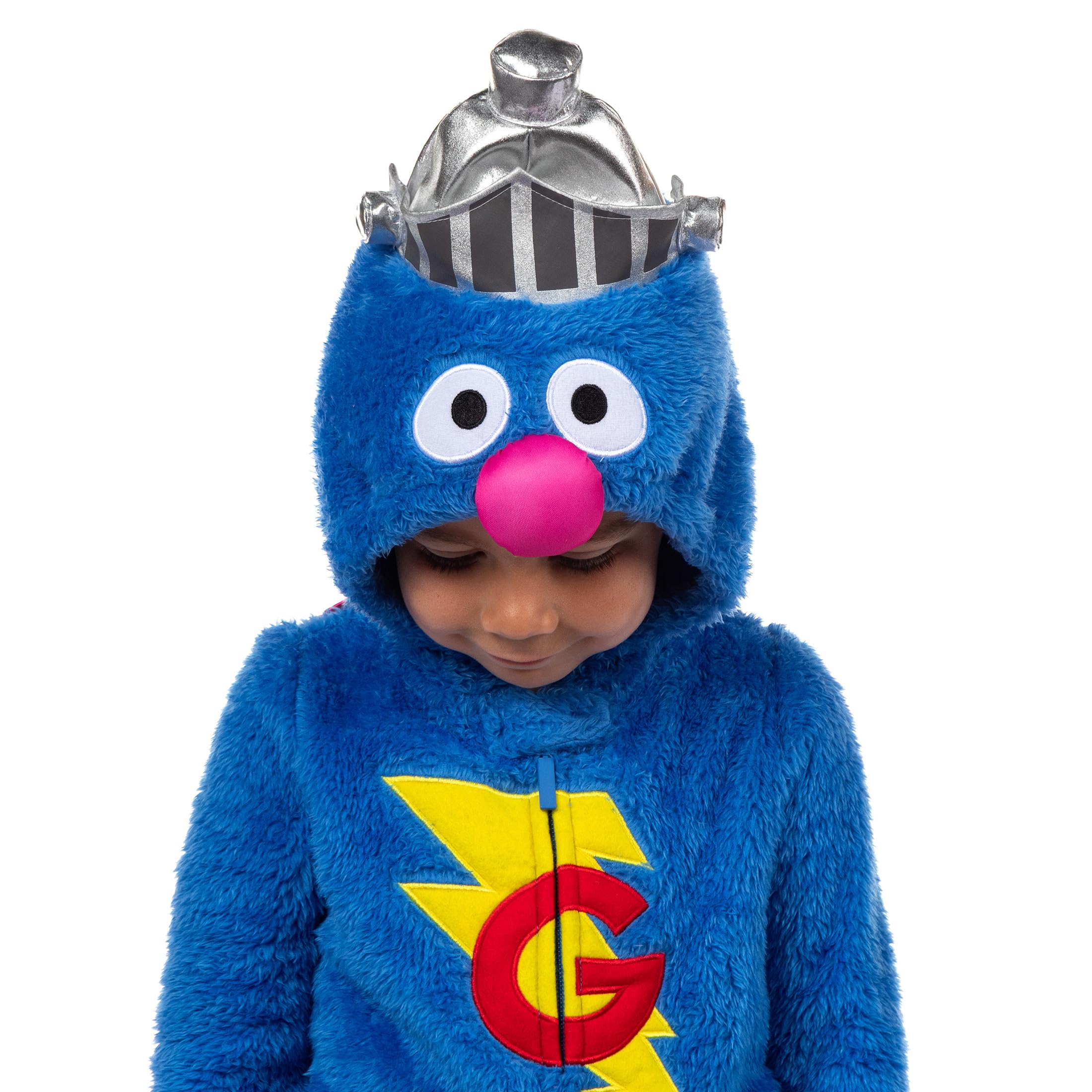 3D Character Details Kids Recognize: Designed to resemble Super Grover from Sesame Street, this one-piece features bold printed graphics of Grover's lightning bolt "G," knight-style helmet, and detachable pink cape. The hood adds extra dimension with Grover's eyes, nose, and printed helmet crown built right in.