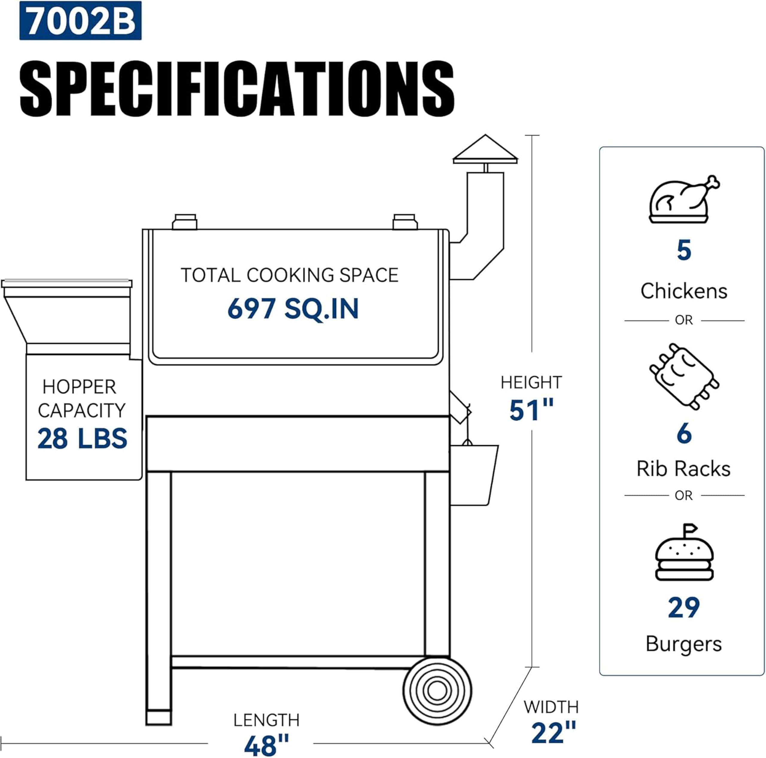 HUGE COOKING SPACE - 700 sq. In grilling space that can accommodate 30 burgers, 6 rib racks, or 5 chickens effortlessly. Great for Home, party, and tailgating, easy to assemble and move