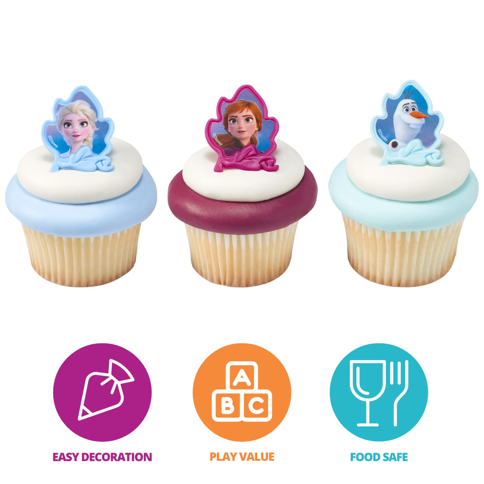 Frozen II Cupcake Rings - 24 cupcake toppers featuring Anna, Elsa, and Olaf the snowman! Bring Frozen II and a colorful Arctic chill to the dessert table and make your sweet treats extra special.